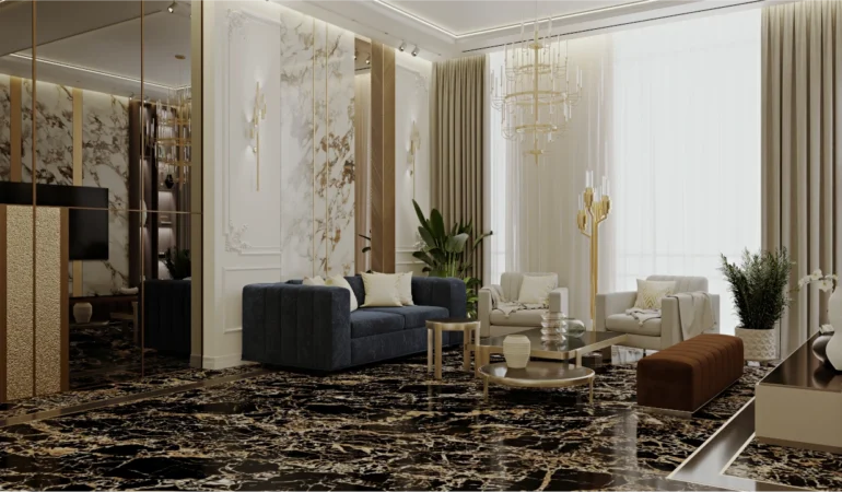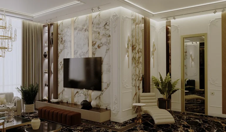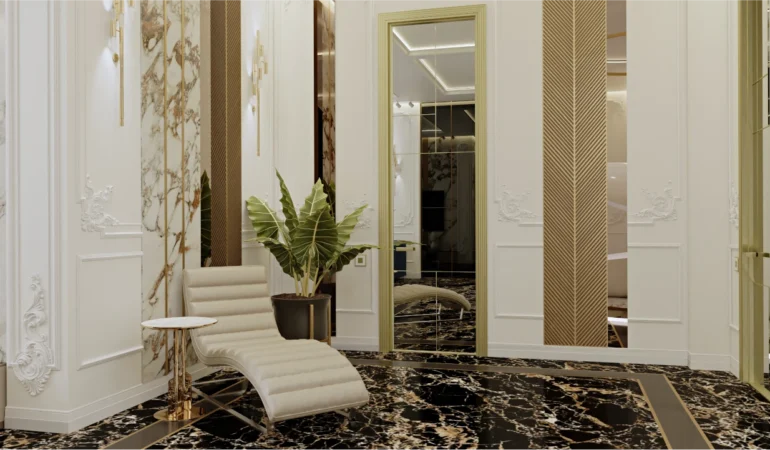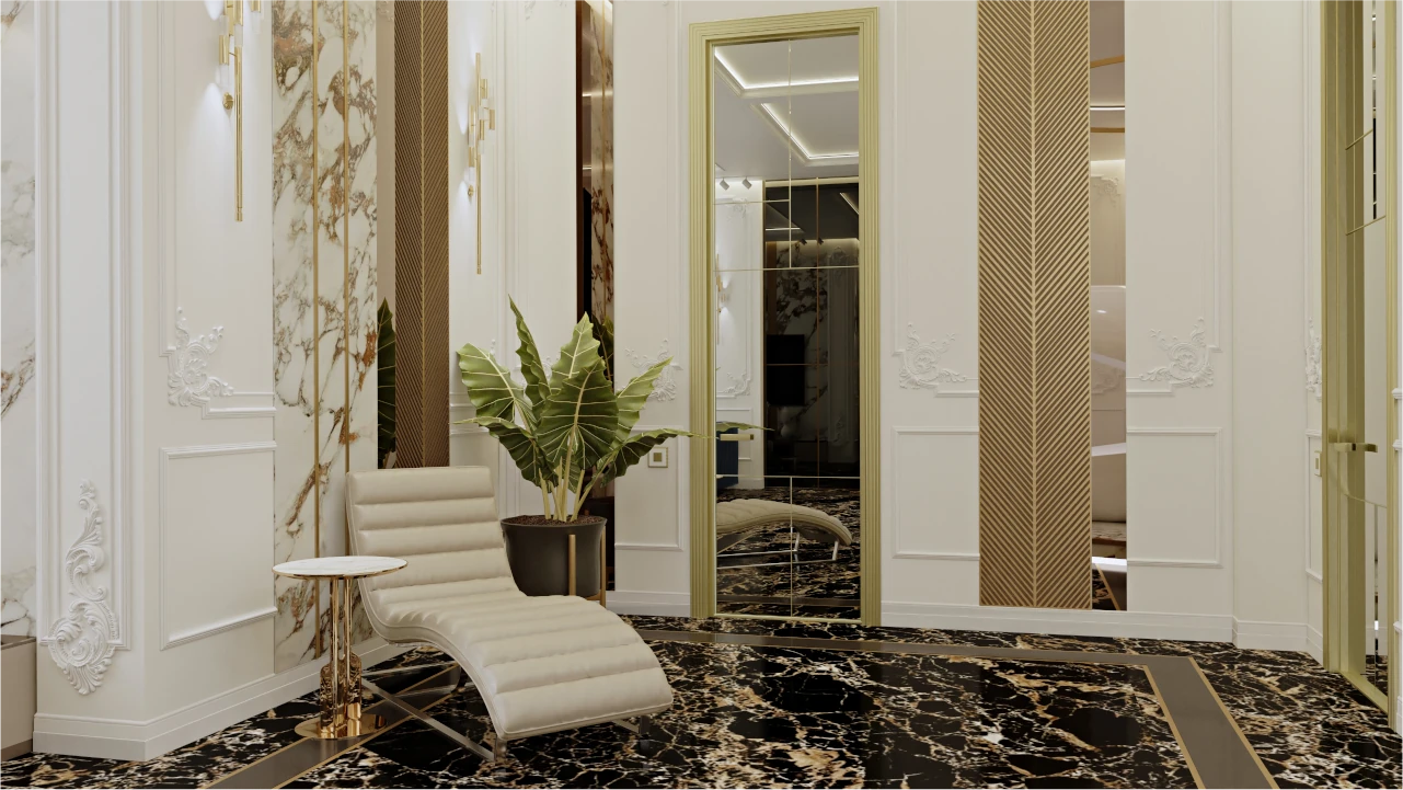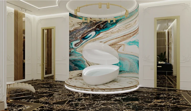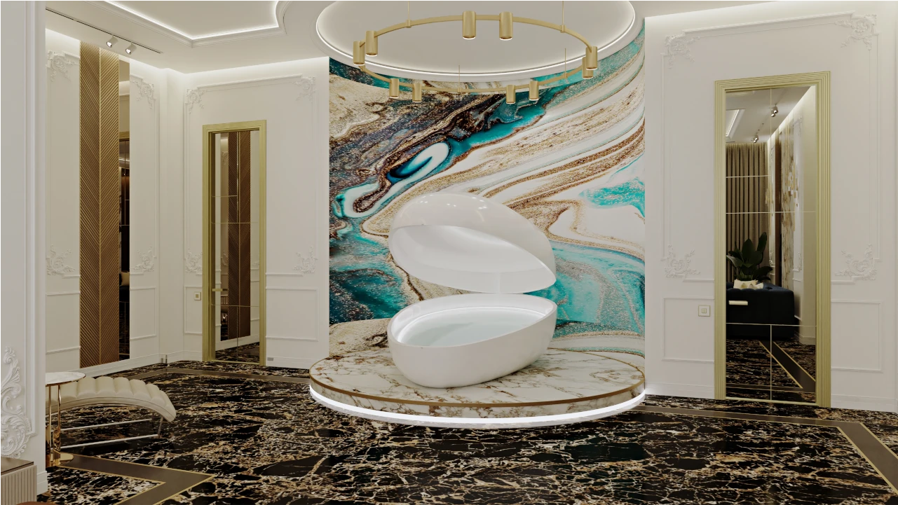 Le design intérieur de la capsule flottante dans un immeuble résidentiel, situé dans une pièce spacieuse de 56 m², incarne l’élégance et le calme du style néoclassique. L’élément central de l’espace est la capsule elle-même, qui est placée sur un piédestal exquis, ce qui lui confère une solennité et une attention particulières.