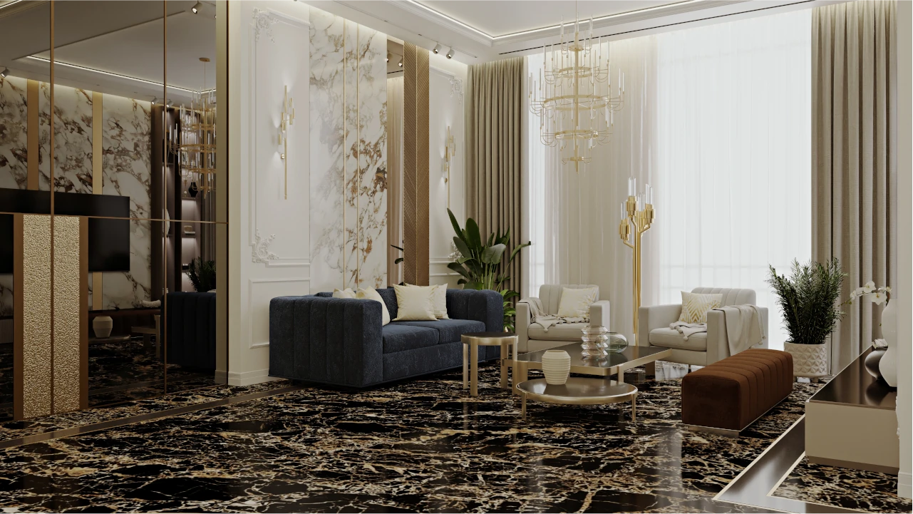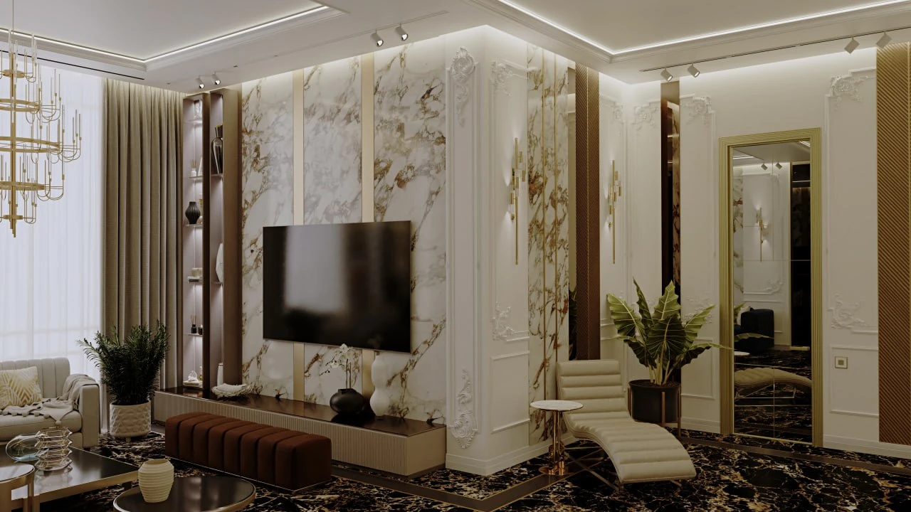 En plus de la capsule, la chambre est équipée d’un canapé et d’un ensemble de fauteuils disposés de manière à créer un coin salon confortable pour les conversations ou pour regarder la télévision, qui se trouve sur l’un des murs de la chambre. Les éléments du mobilier sont réalisés dans des couleurs subtiles, avec l’ajout de nuances délicates et de formes classiques typiques du néoclassicisme, ce qui confère un sentiment d’harmonie et d’intégrité à l’intérieur.