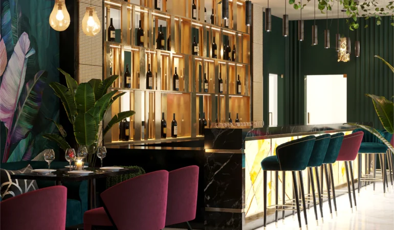 Des tables avec quatre chaises sont placées au centre de la salle, organisant l’espace de manière à maintenir un sentiment d’ouverture et de facilité de communication entre les visiteurs. Le bar du hall ne remplit pas seulement un rôle fonctionnel, mais devient également un élément lumineux de l’intérieur, invitant les invités à déguster un large éventail de boissons.