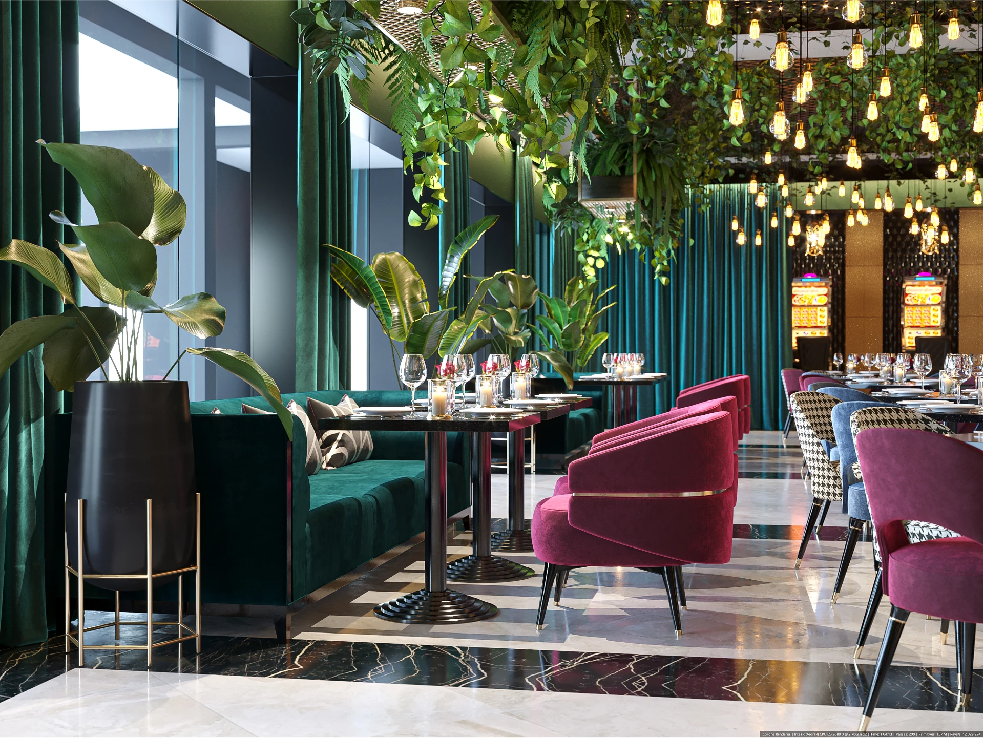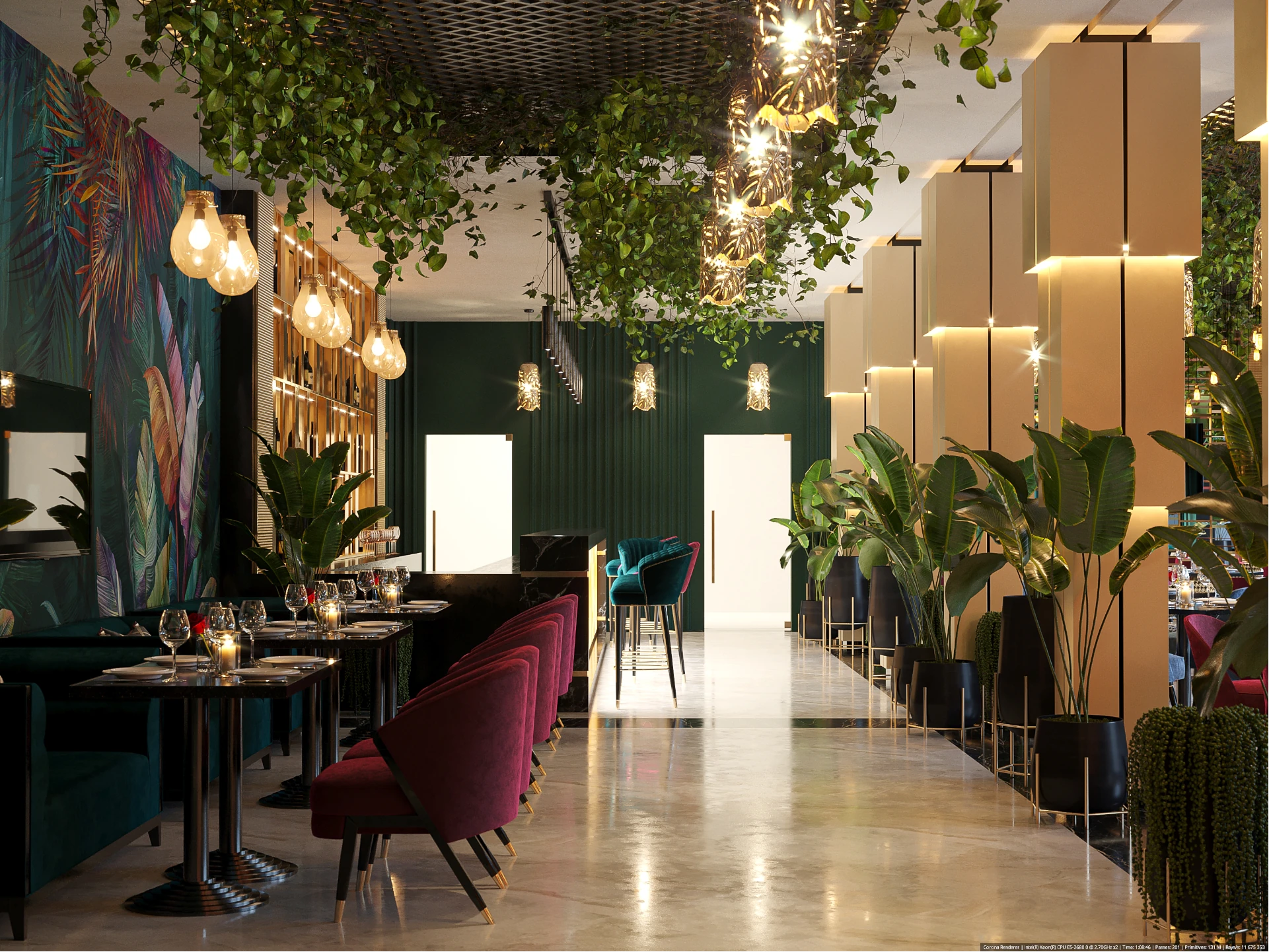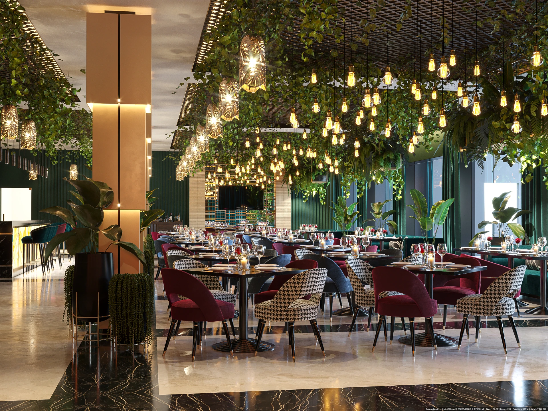 La salle principale du restaurant, d’une superficie de 240 m², est décorée avec une attention particulière aux détails, créant une atmosphère d’harmonie naturelle et d’élégance. Le rôle central de la décoration intérieure est joué par le plafond vert, à partir duquel des lampes suspendues apportent une lumière douce et agréable à l’espace.