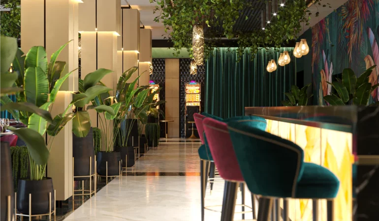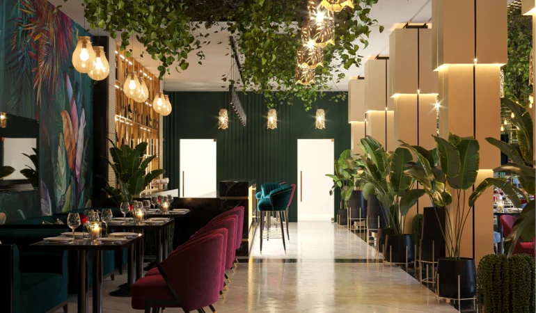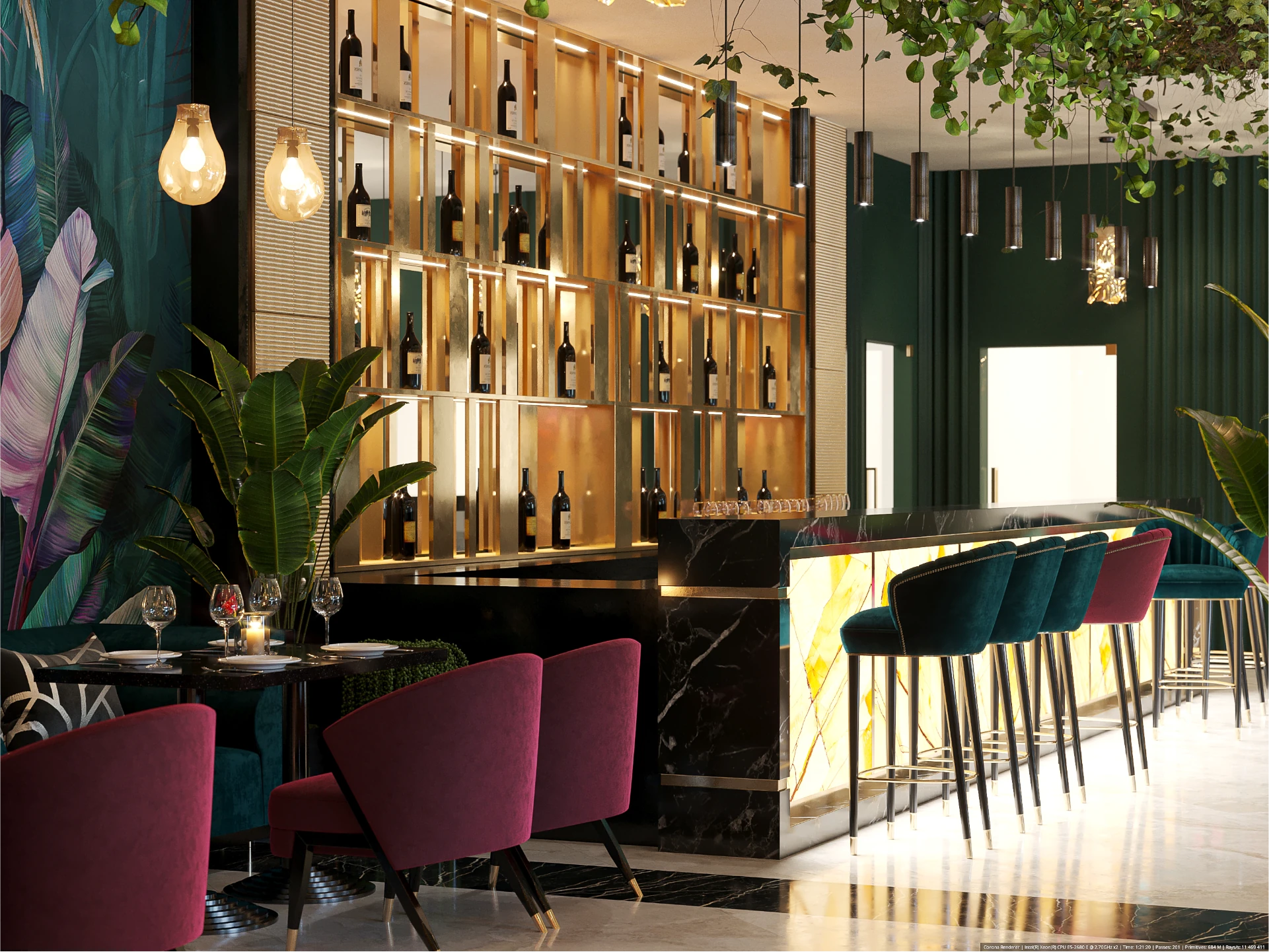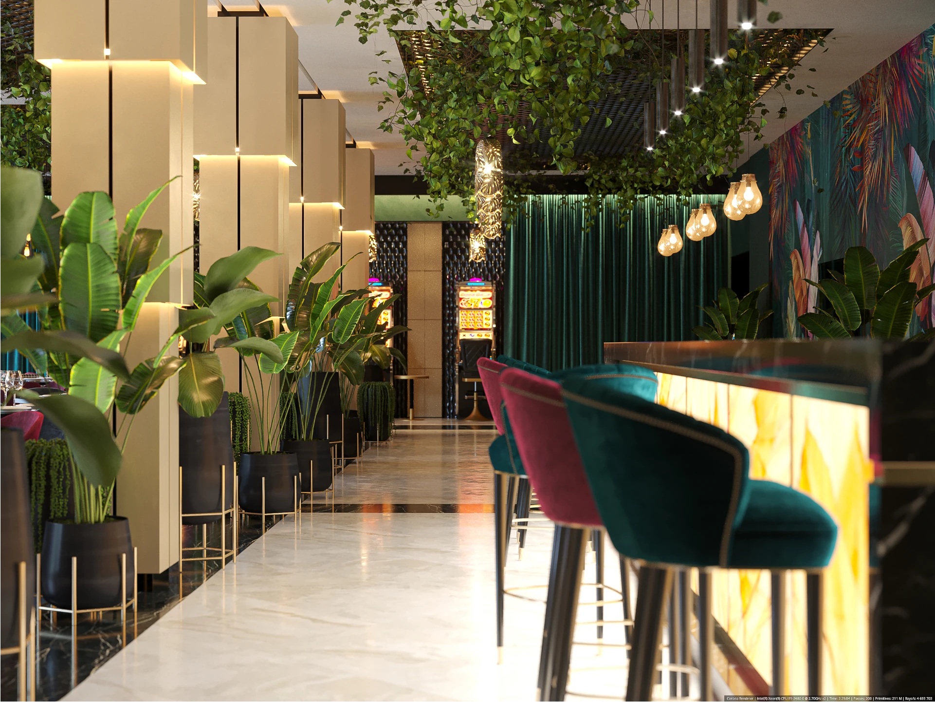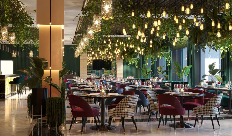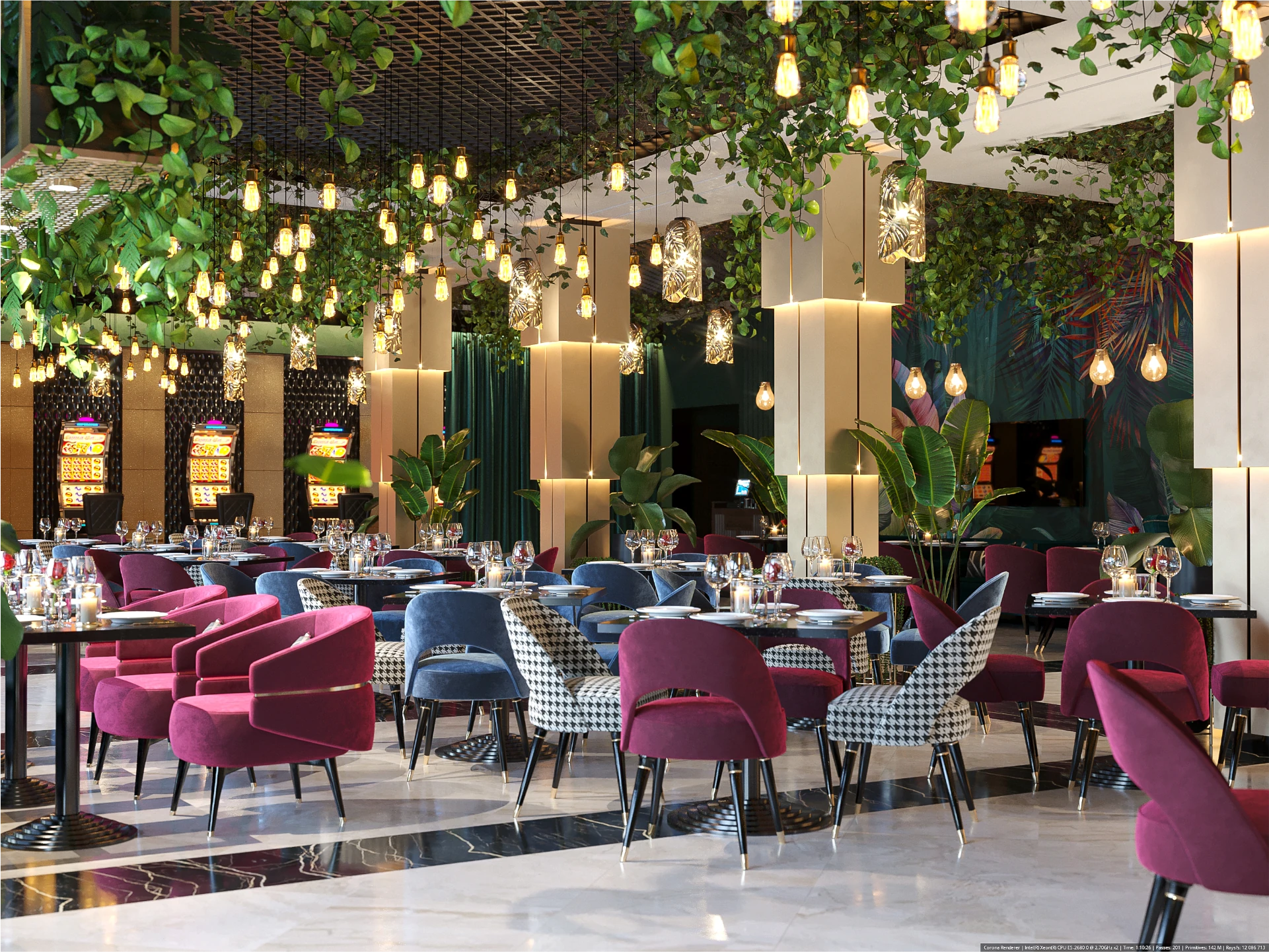La salle principale du restaurant, d’une superficie de 240 m², est décorée avec une attention particulière aux détails, créant une atmosphère d’harmonie naturelle et d’élégance. Le rôle central de la décoration intérieure est joué par le plafond vert, à partir duquel des lampes suspendues apportent une lumière douce et agréable à l’espace.