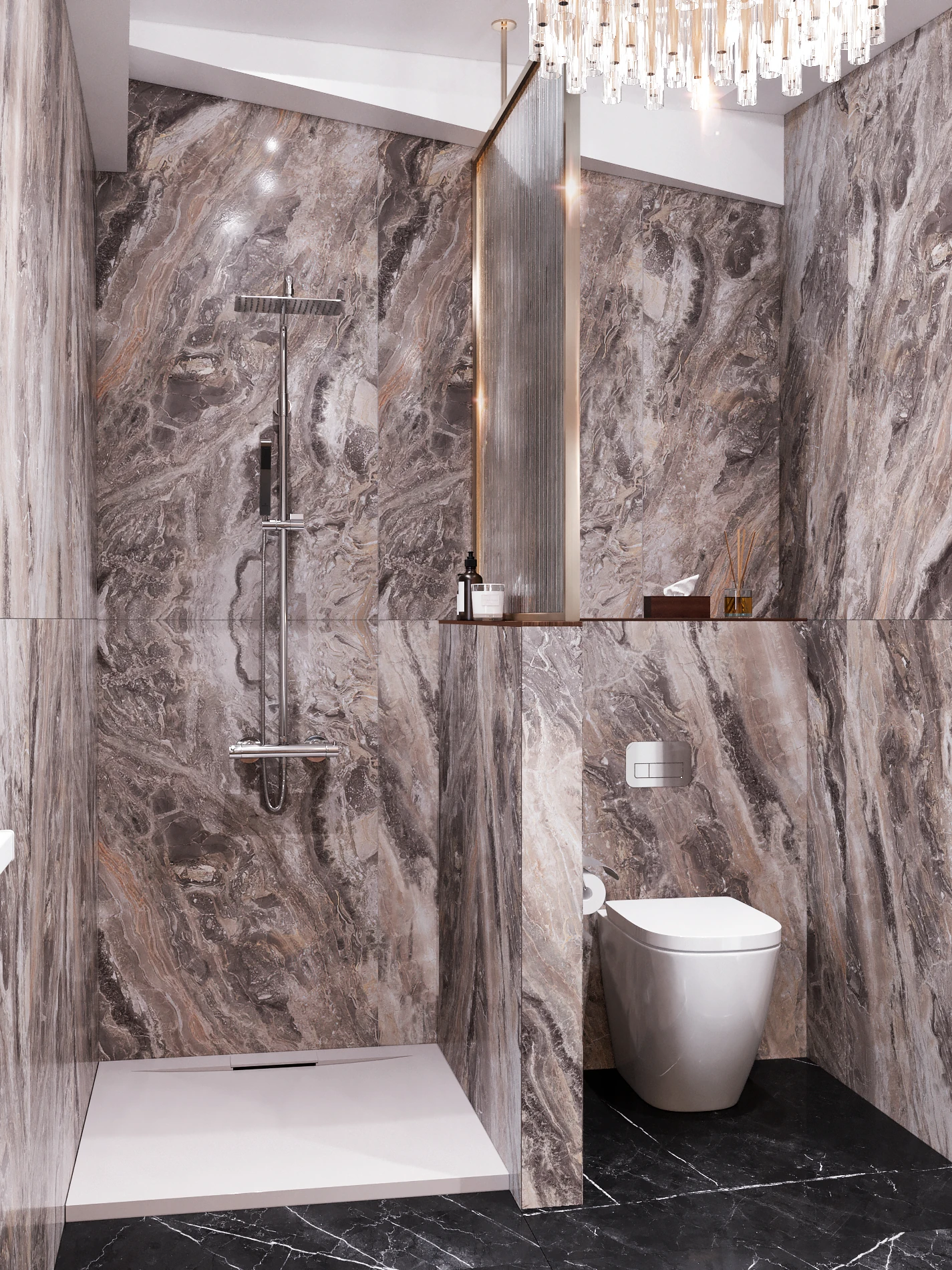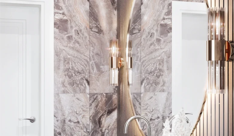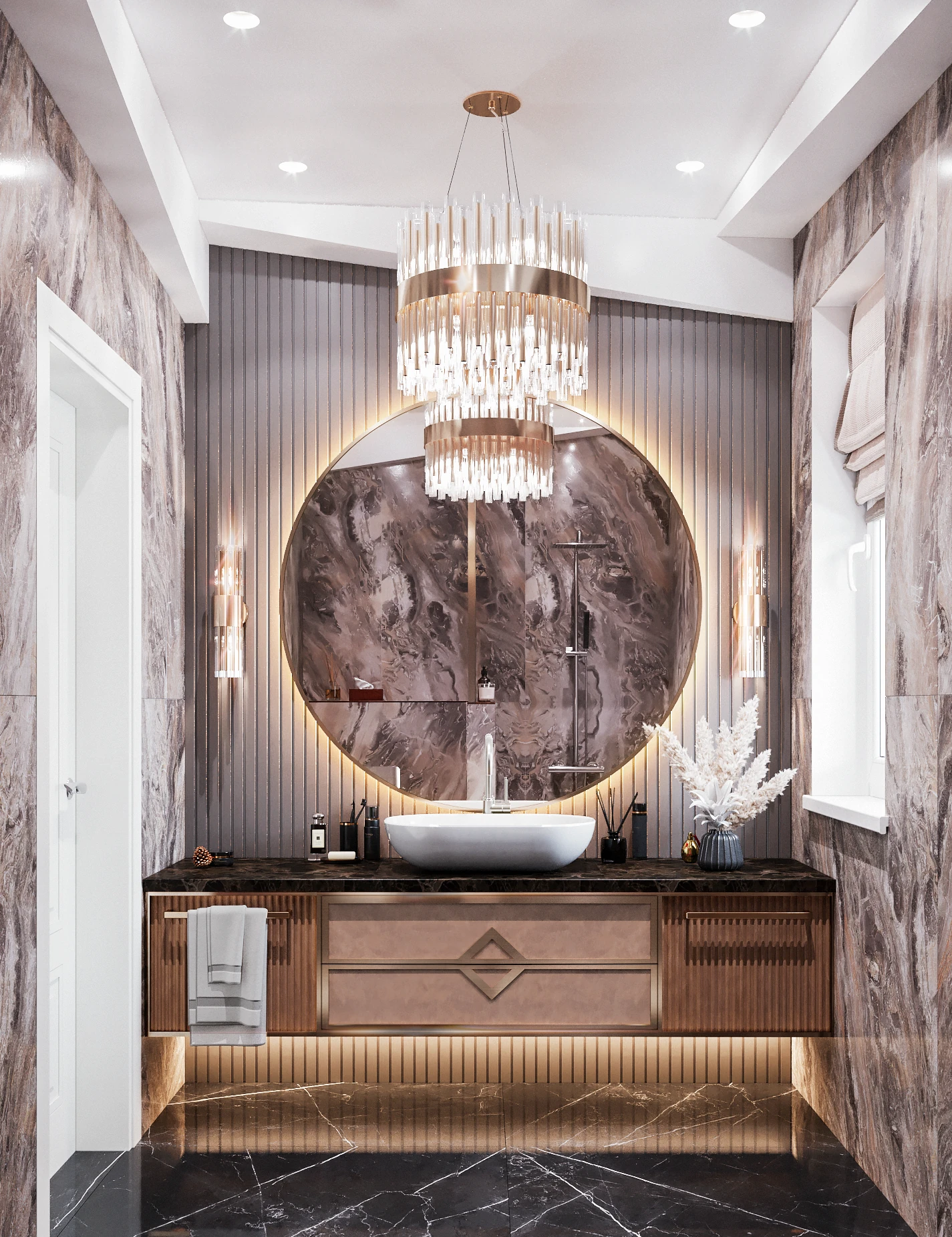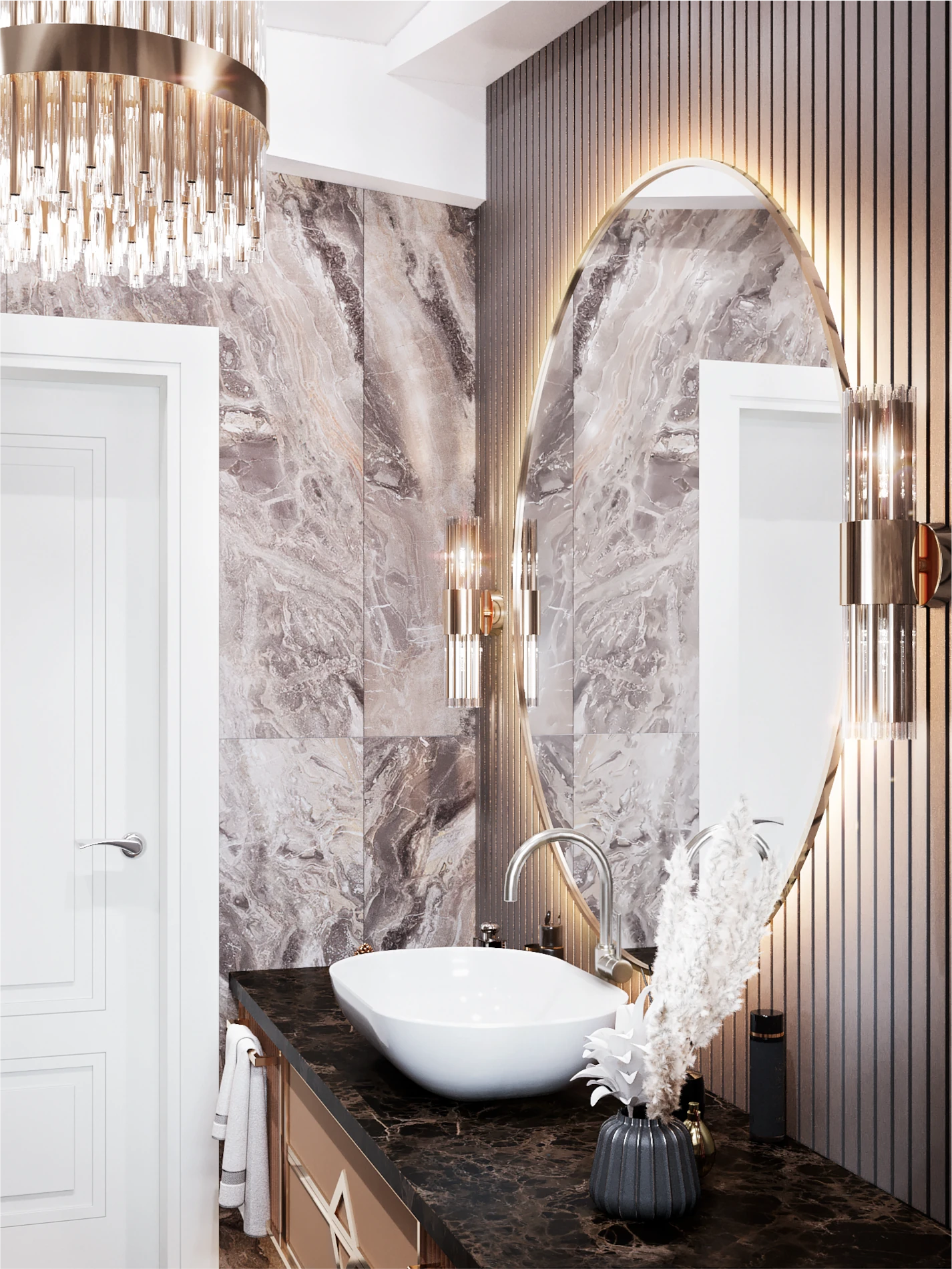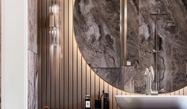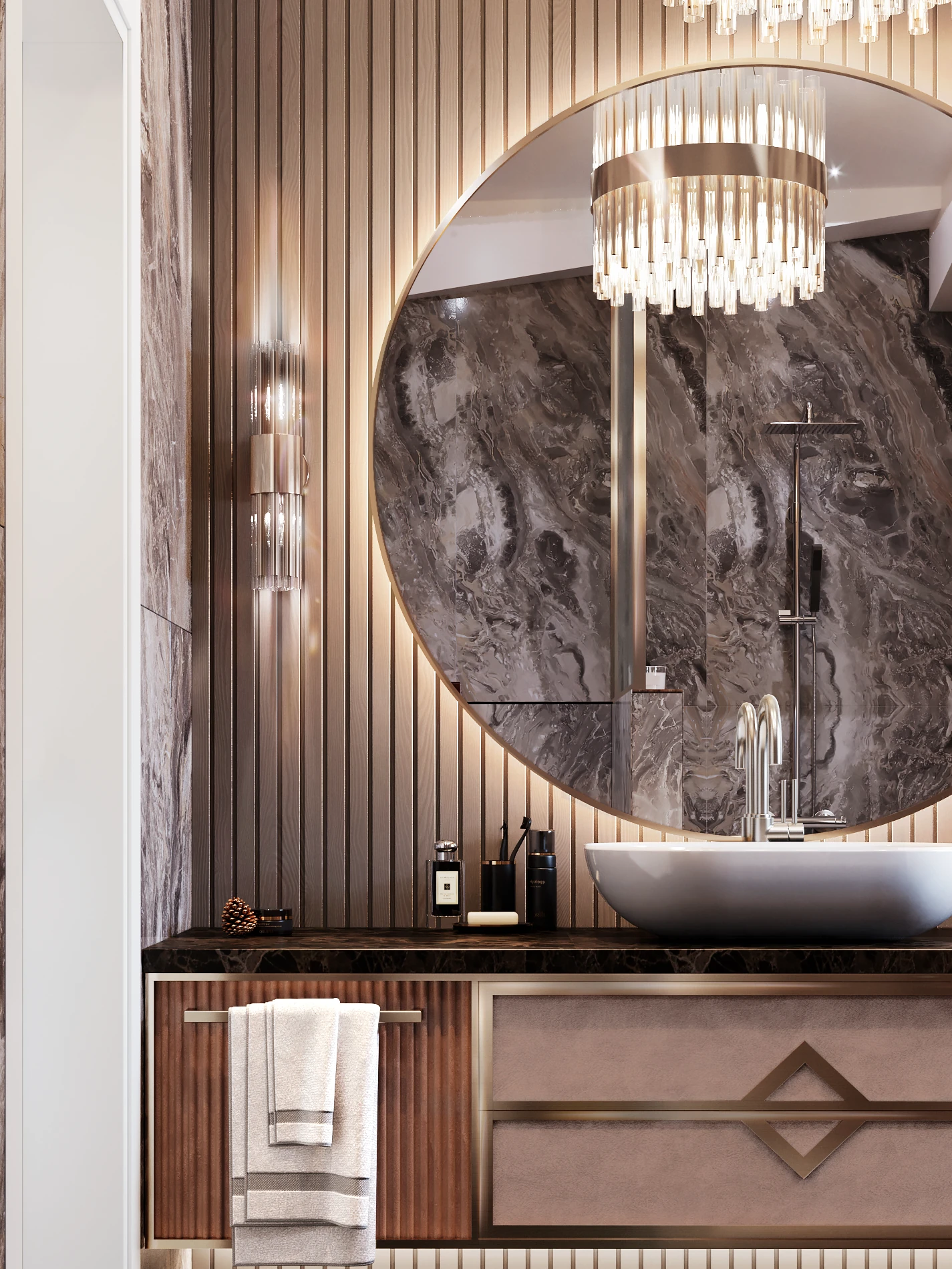 La palette de couleurs est basée sur des tons naturels pastel, complétés par des accents lumineux et sombres qui soulignent la géométrie de l’espace et la sévérité des formes. Des éléments dorés et des détails intérieurs sculptés ajoutent une touche de luxe à l’espace.