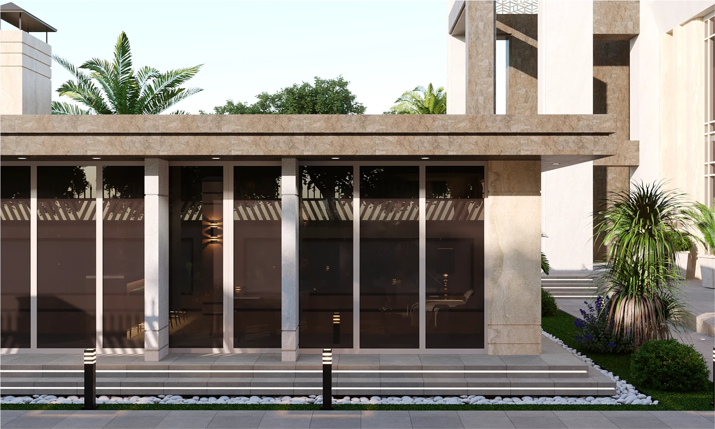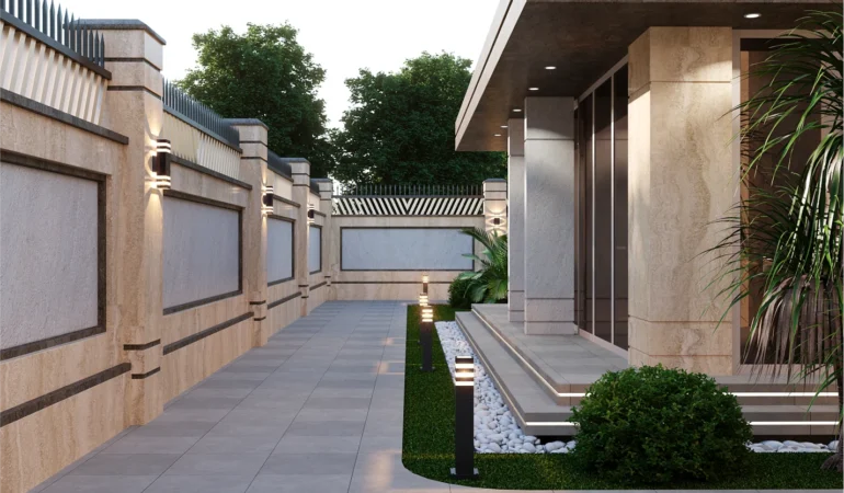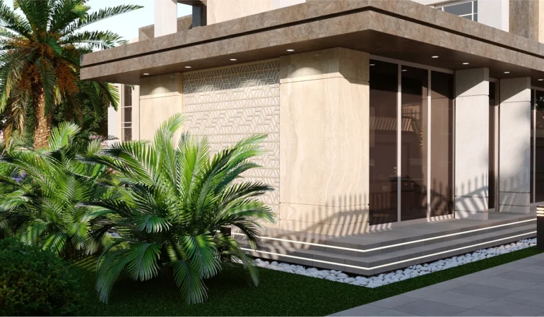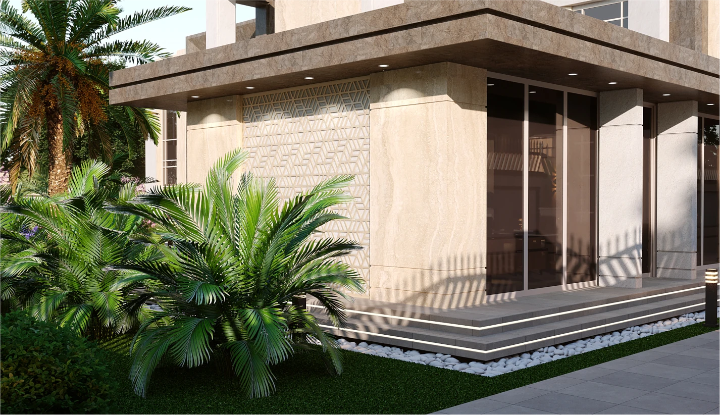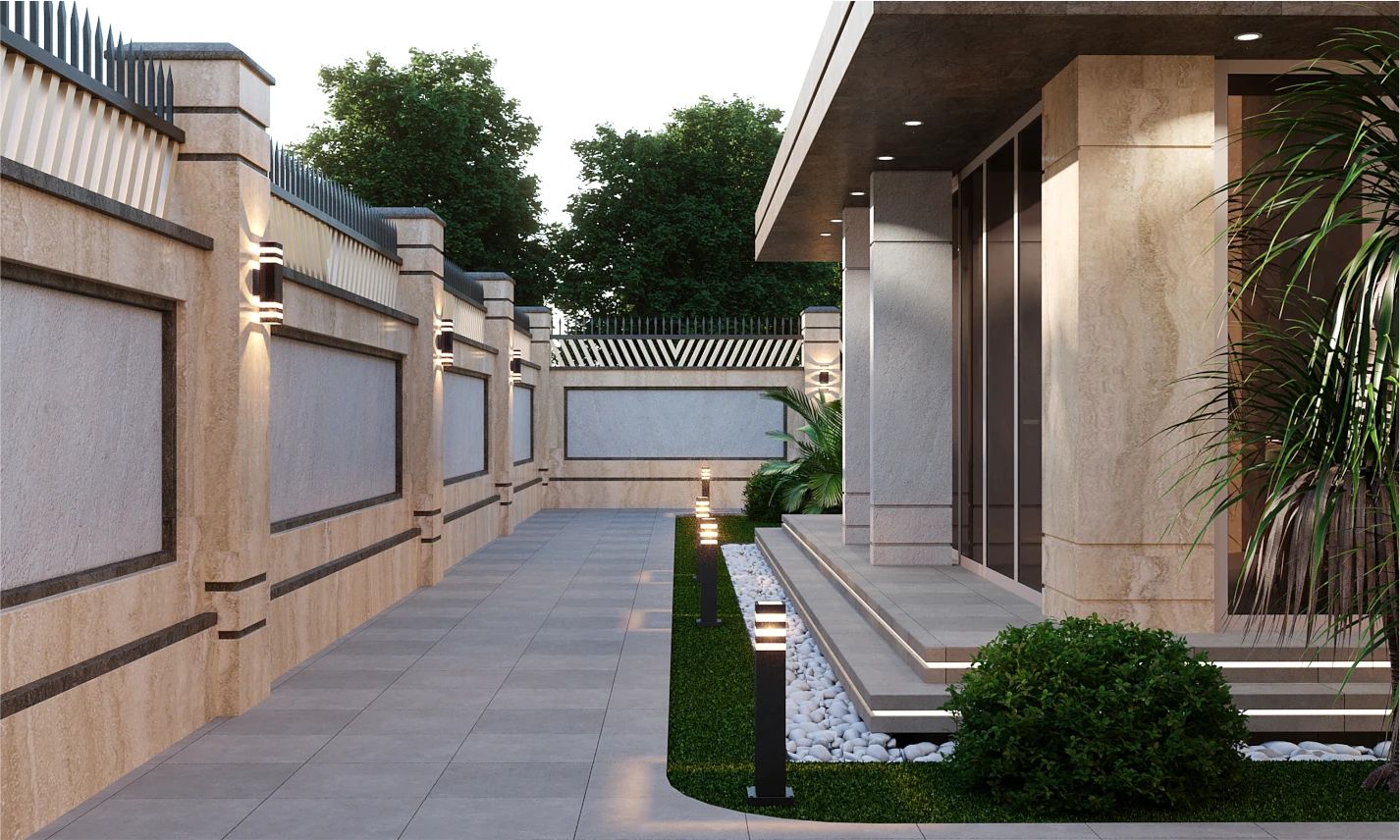 Екстер’єр житлового будинку відрізняється сучасним виконанням, де основну роль відіграє вишуканість матеріалів та продумане освітлення. Фасад будинку демонструє гармонійне поєднання натуральних відтінків граніту від світло-сірого до піщаного, створюючи враження стилю та стабільності. Сучасна лед підсвітка надає будівлі особливого шарму після заходу сонця, підкреслюючи унікальність архітектурних ліній та текстуру облицювальних матеріалів.