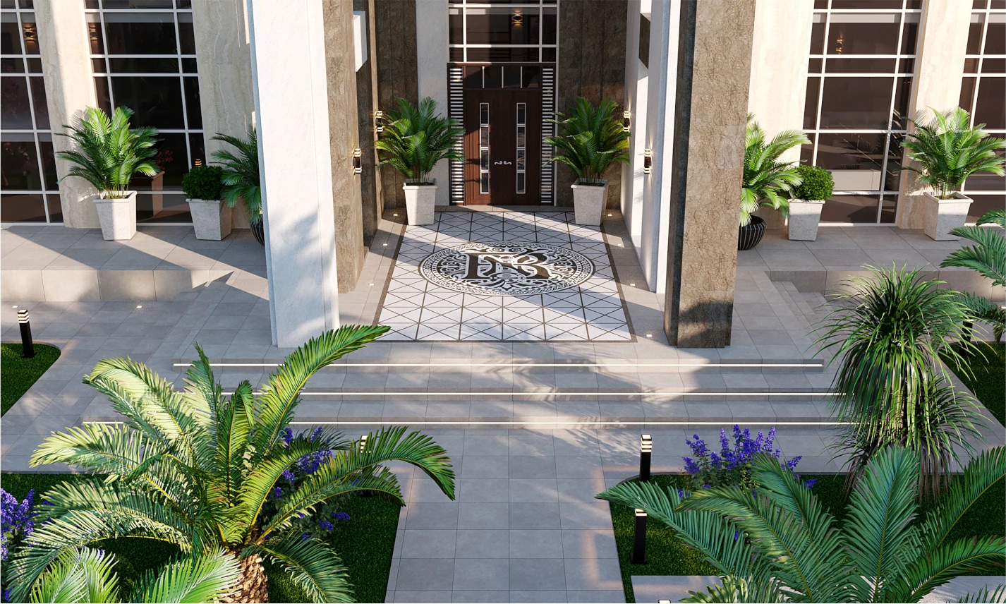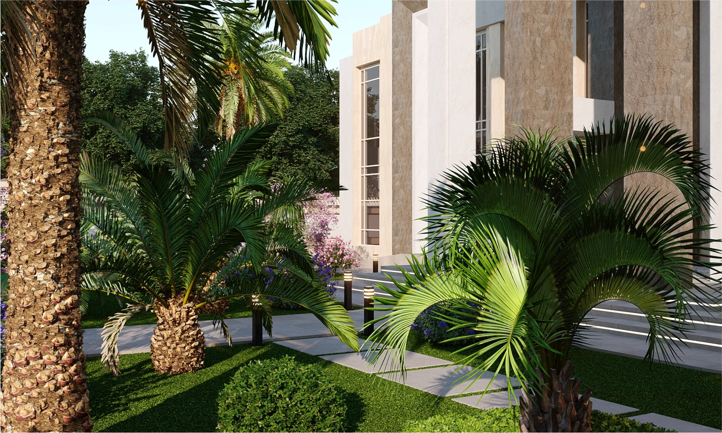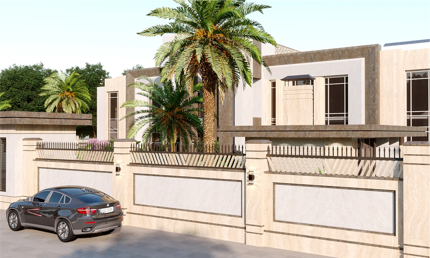 Екстер’єр житлового будинку відрізняється сучасним виконанням, де основну роль відіграє вишуканість матеріалів та продумане освітлення. Фасад будинку демонструє гармонійне поєднання натуральних відтінків граніту від світло-сірого до піщаного, створюючи враження стилю та стабільності. Сучасна лед підсвітка надає будівлі особливого шарму після заходу сонця, підкреслюючи унікальність архітектурних ліній та текстуру облицювальних матеріалів.