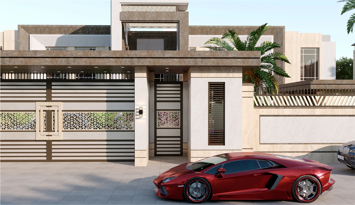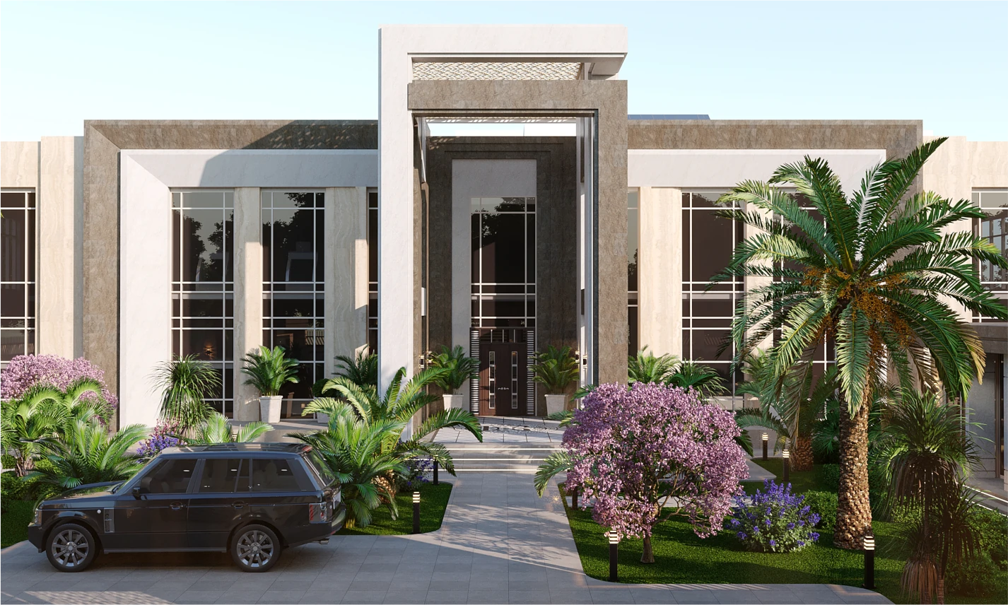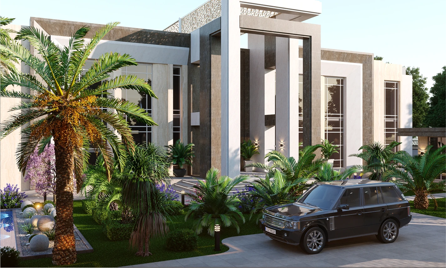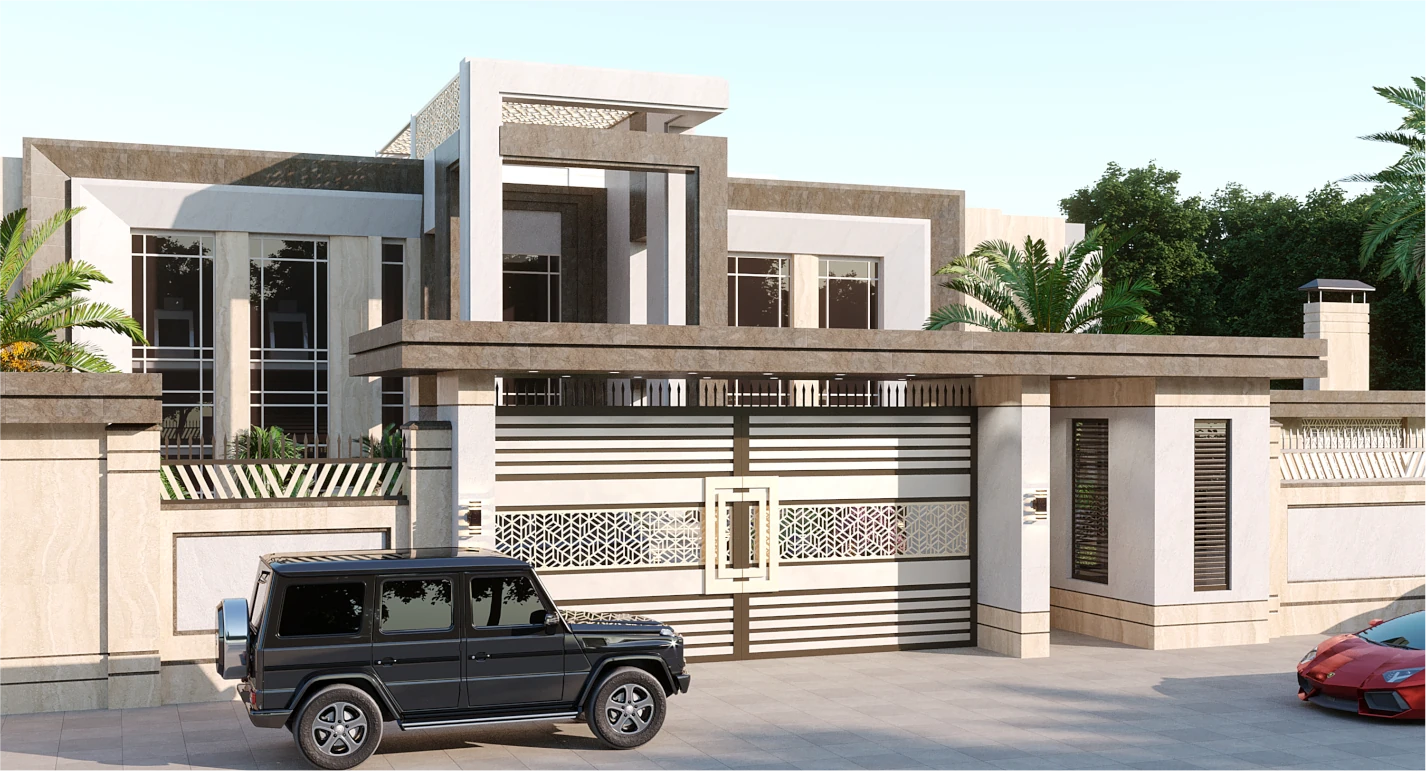 Екстер’єр житлового будинку відрізняється сучасним виконанням, де основну роль відіграє вишуканість матеріалів та продумане освітлення. Фасад будинку демонструє гармонійне поєднання натуральних відтінків граніту від світло-сірого до піщаного, створюючи враження стилю та стабільності. Сучасна лед підсвітка надає будівлі особливого шарму після заходу сонця, підкреслюючи унікальність архітектурних ліній та текстуру облицювальних матеріалів.