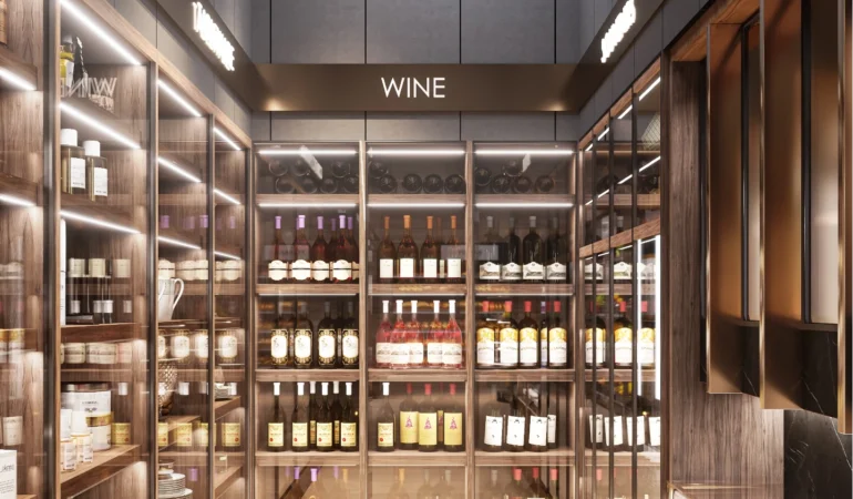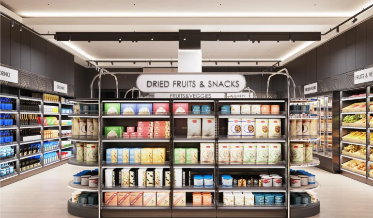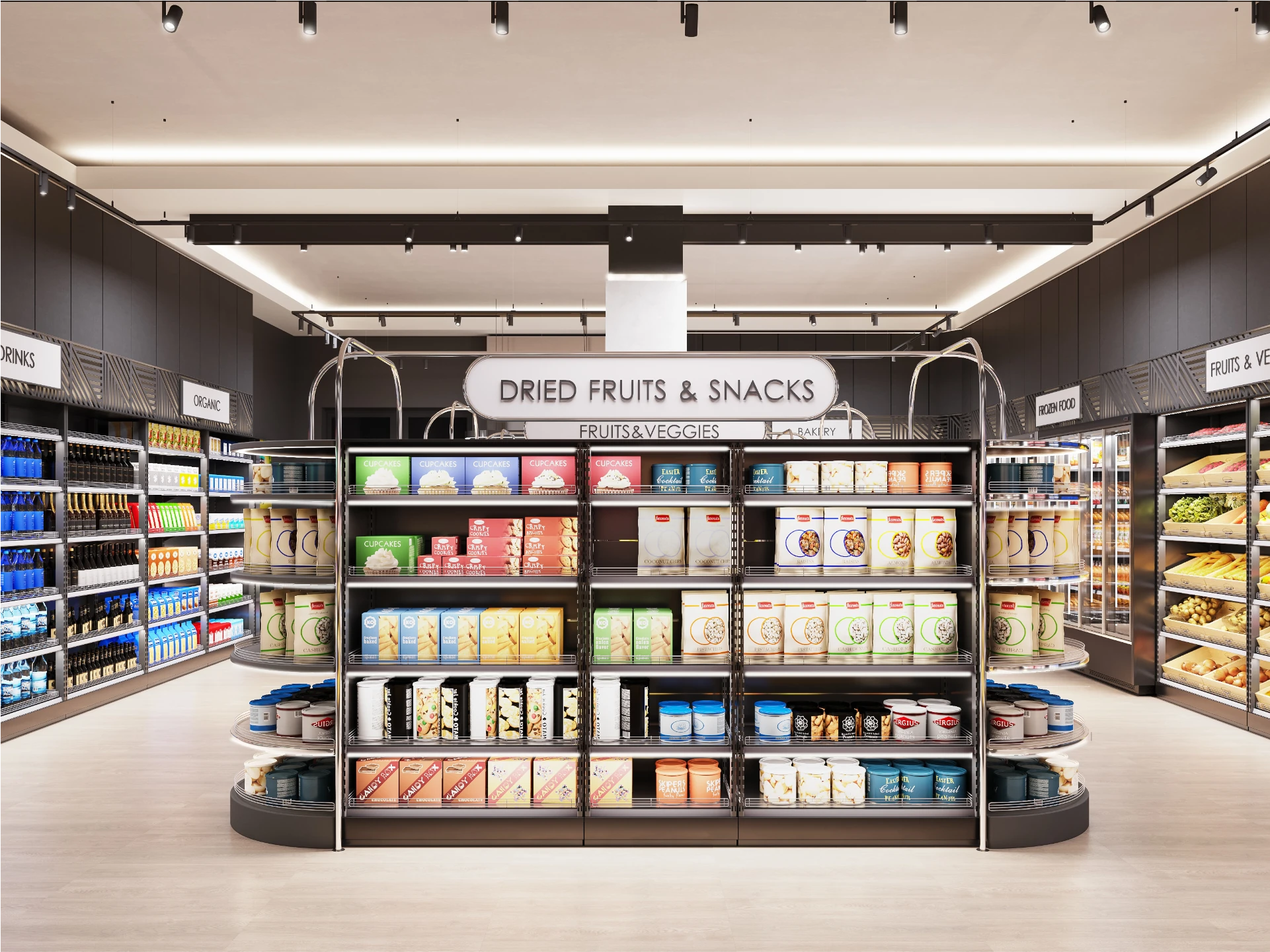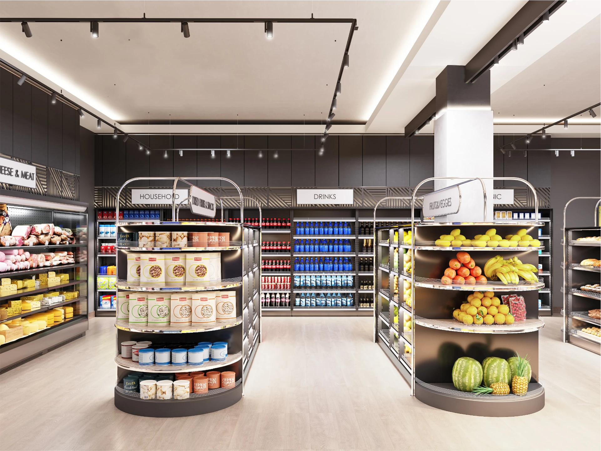 У магазину по периметру розташовані полиці під стінами, що ефективно використовує кожен квадратний метр для демонстрації продукції. Центральну частину основного приміщення займають додаткові ряди з полками, організовані таким чином, щоб забезпечити легкий доступ до товарів і комфортний прохід покупців між секціями.