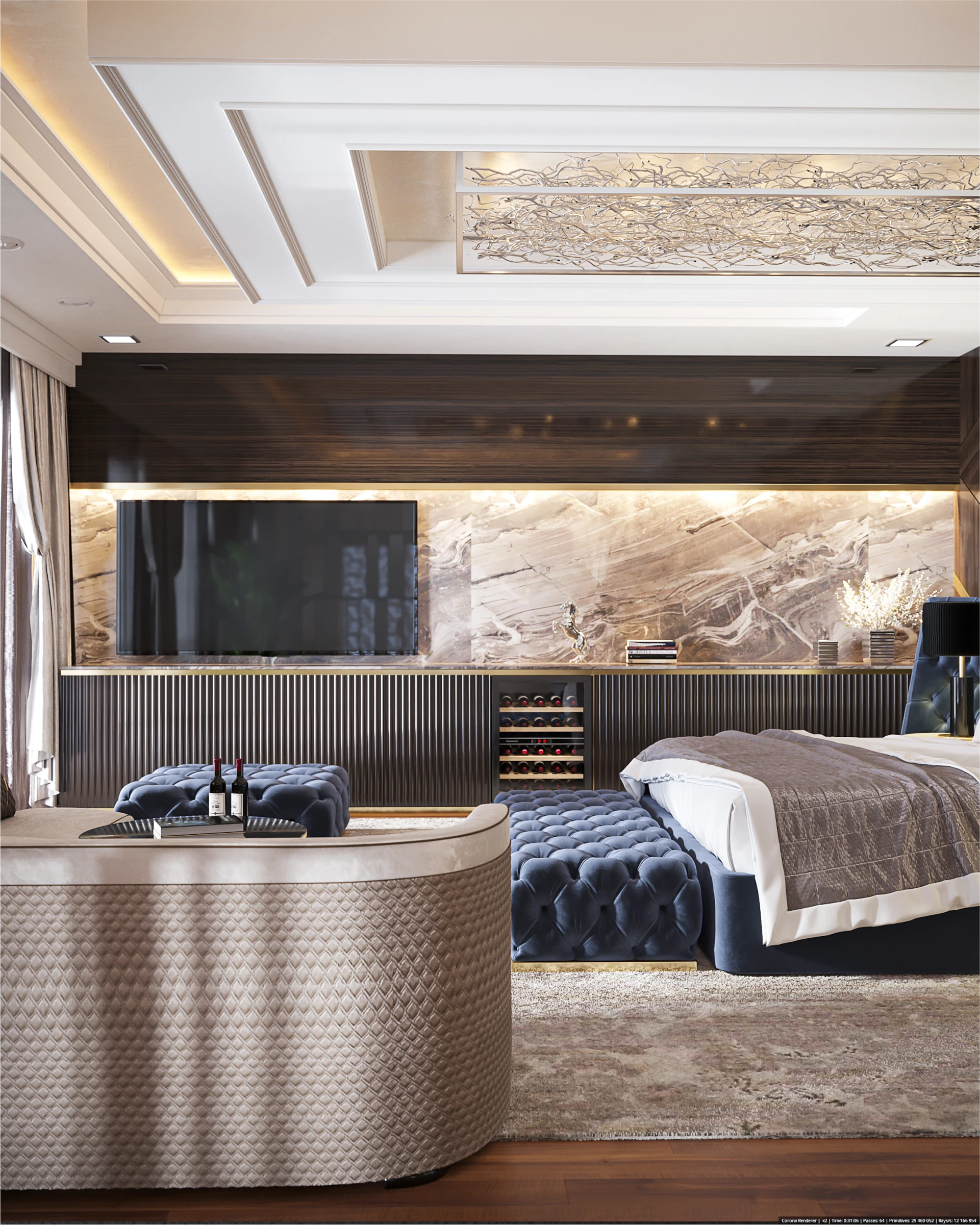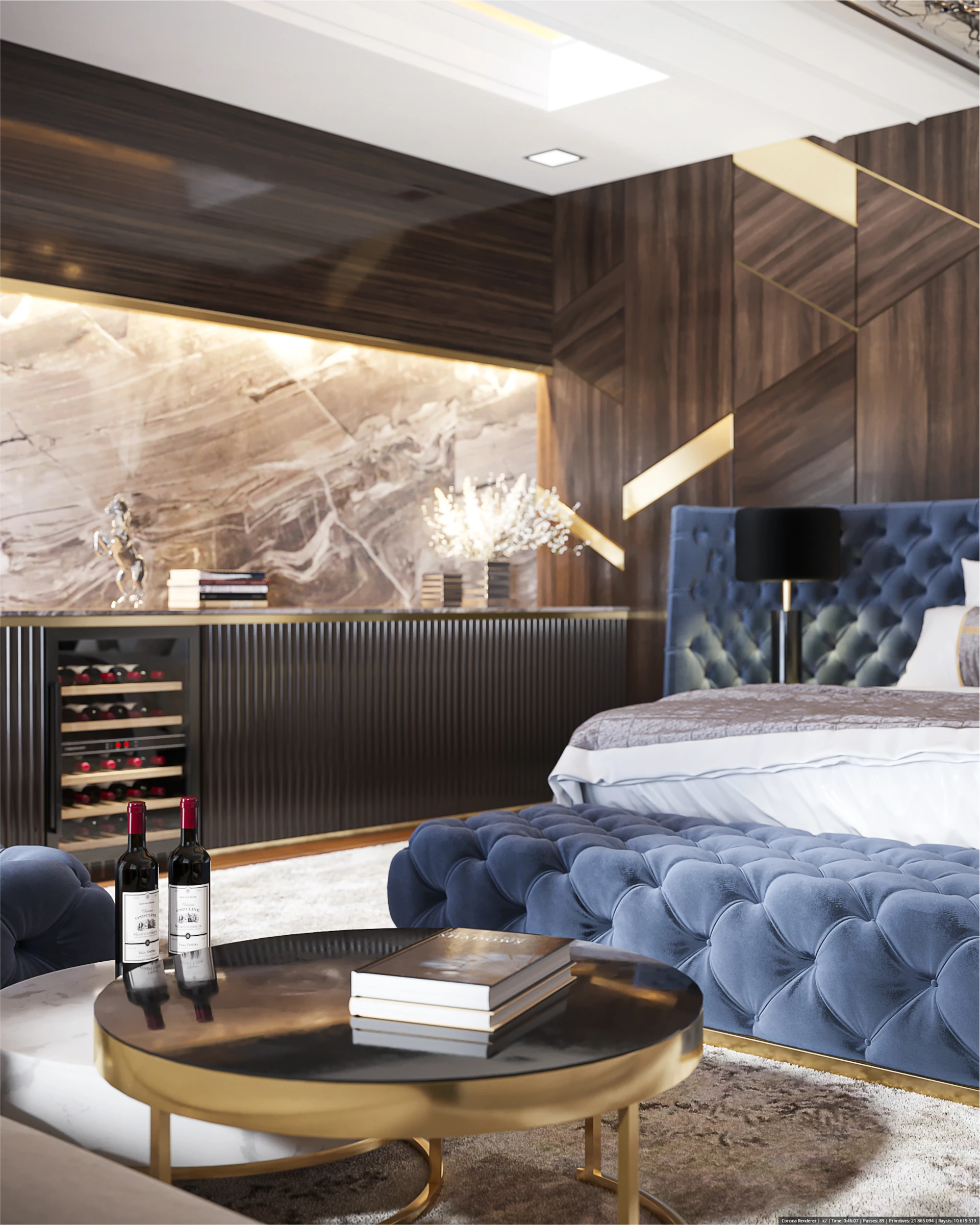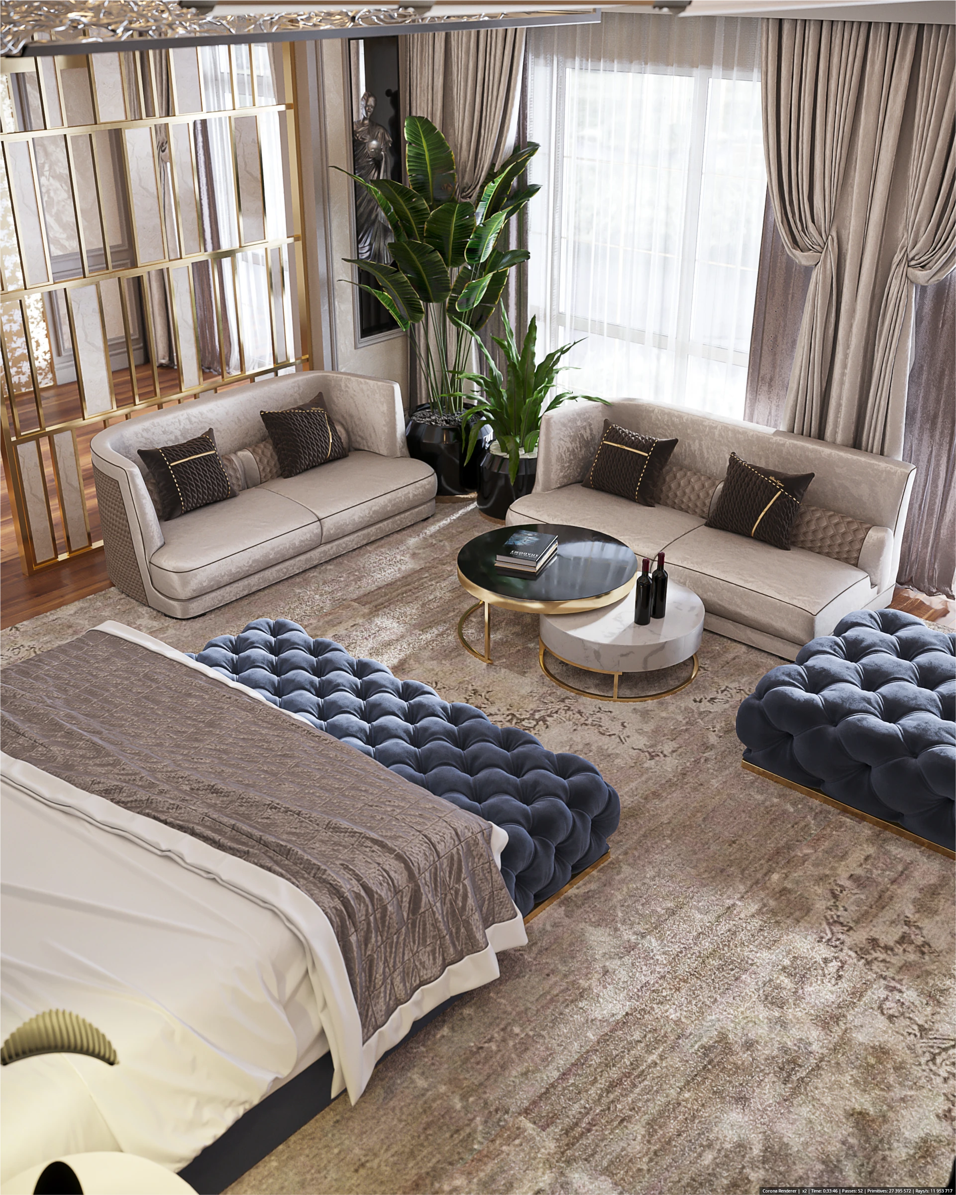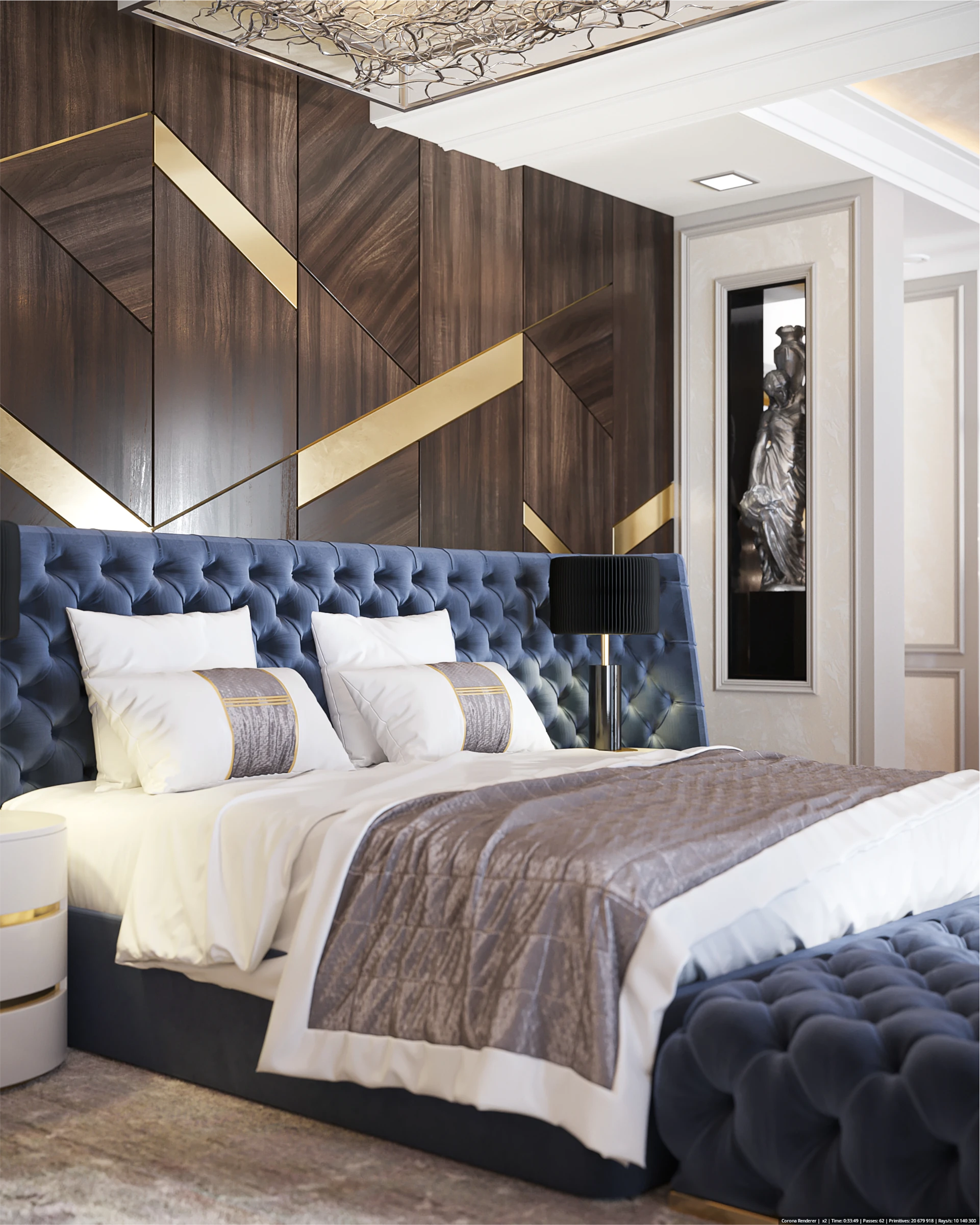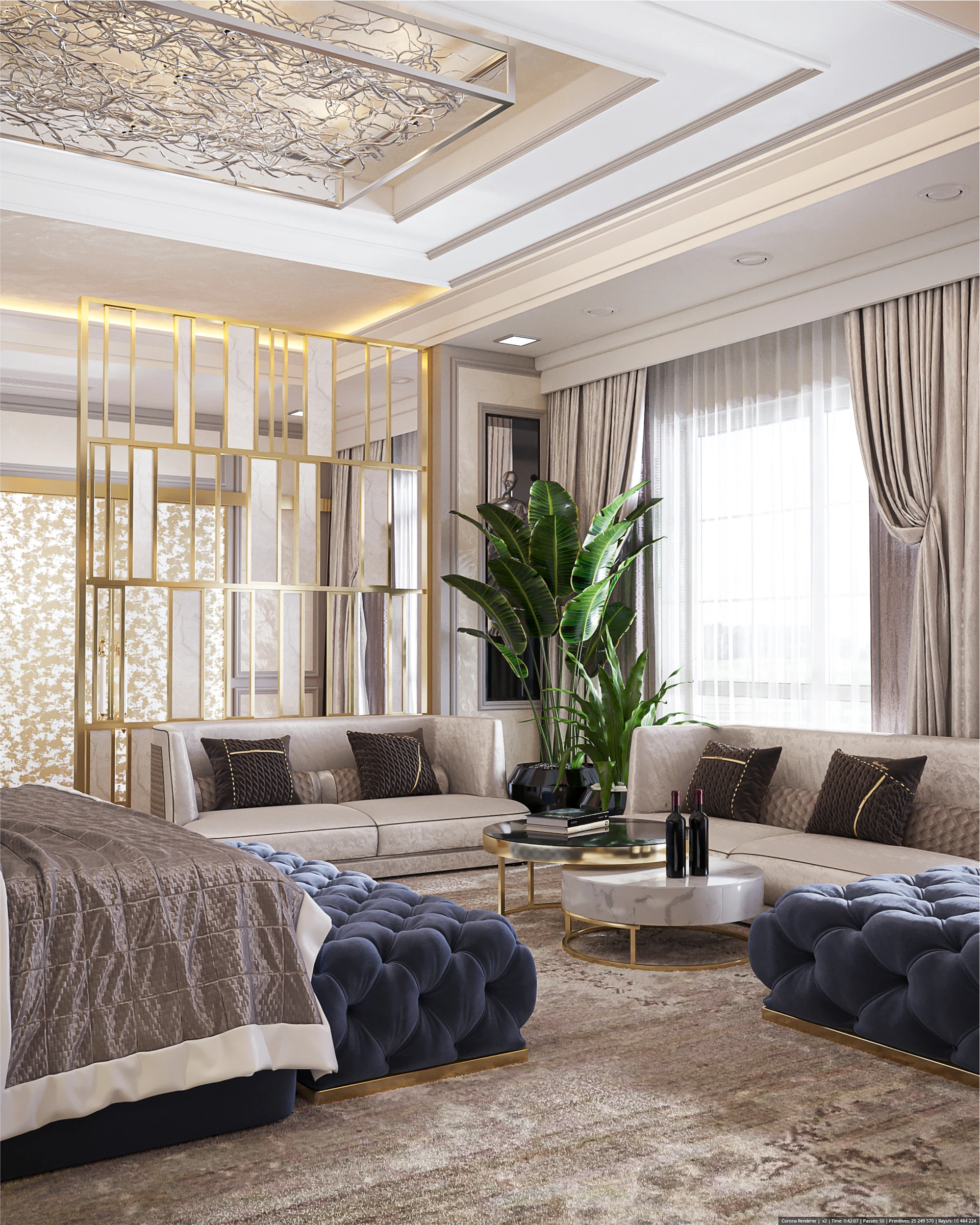Дизайн-проект інтер’єру спальні площею 50м² в стилі неокласики. Проект поєднуює пастельні природні тони з елегантними золотими акцентами. Враховуючи сучасні потреби, дизайн інтегрує в себе розкіш та комфорт, створюючи ідеальний простір для відпочинку. Темні вкраплення вносять глибину, а різьблені елементи декору додають витонченості.