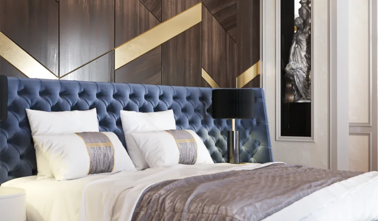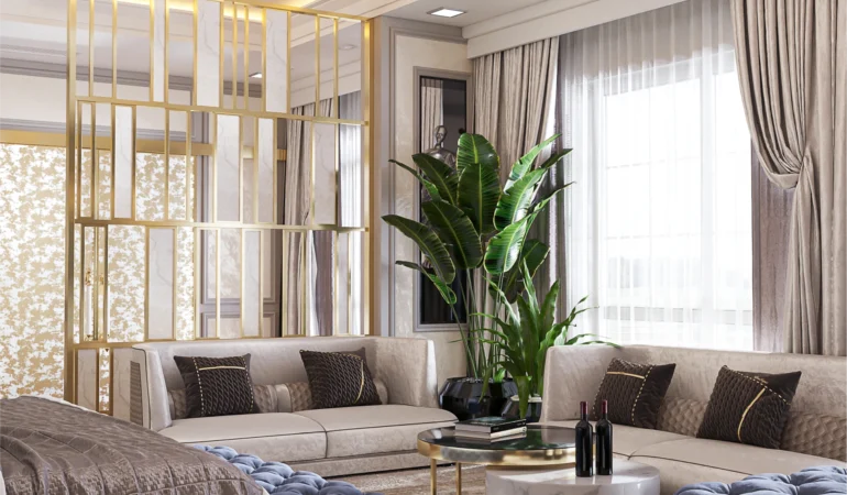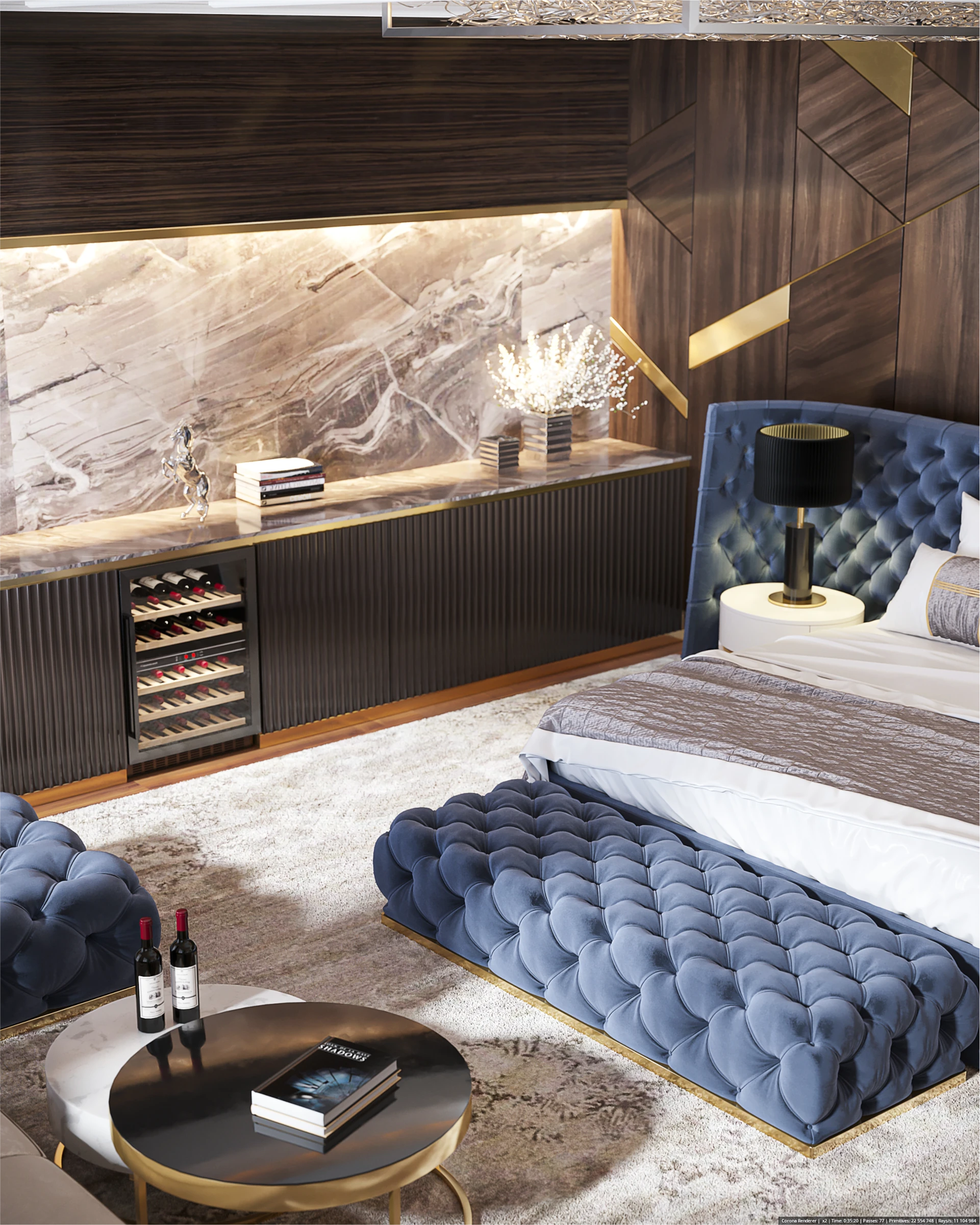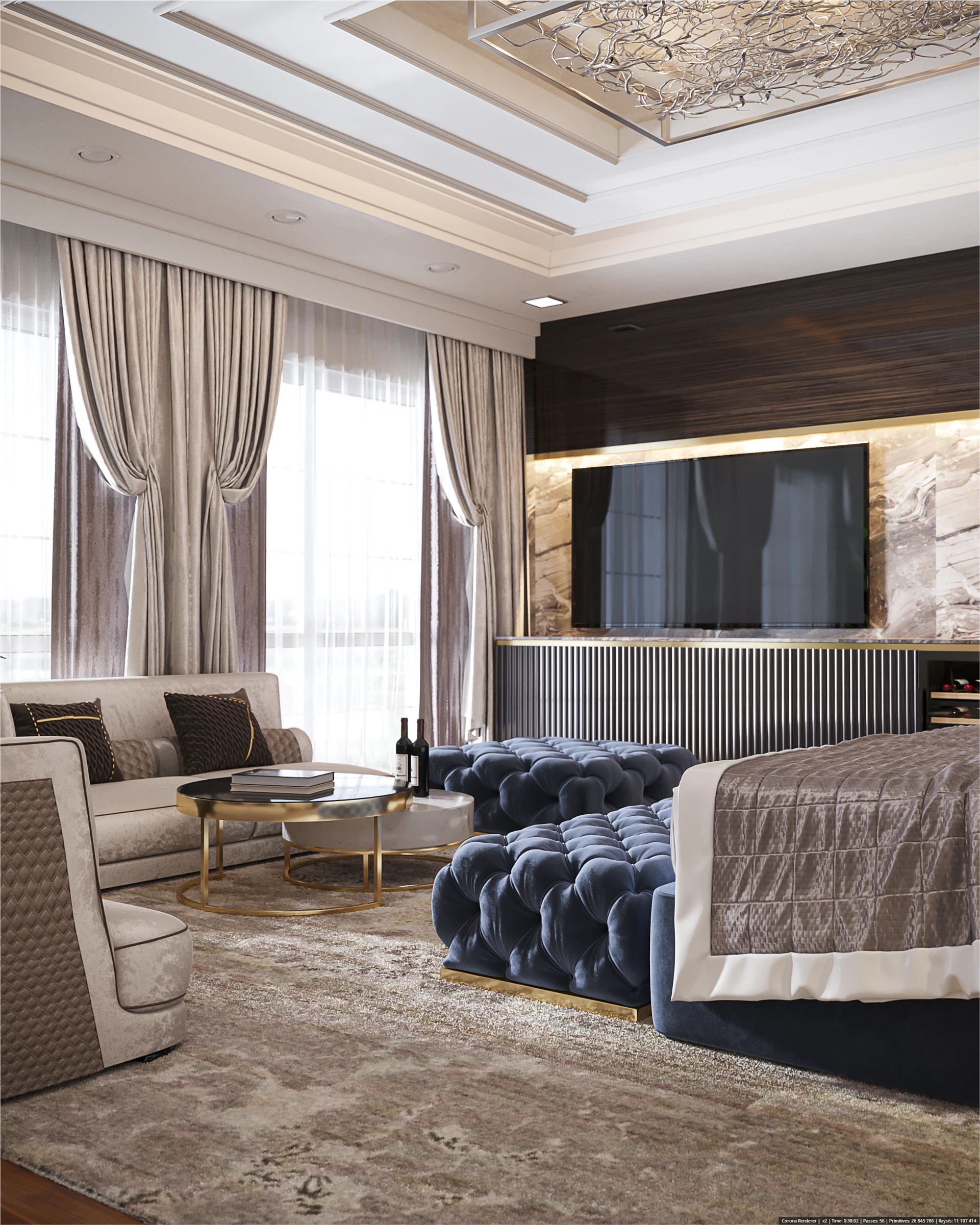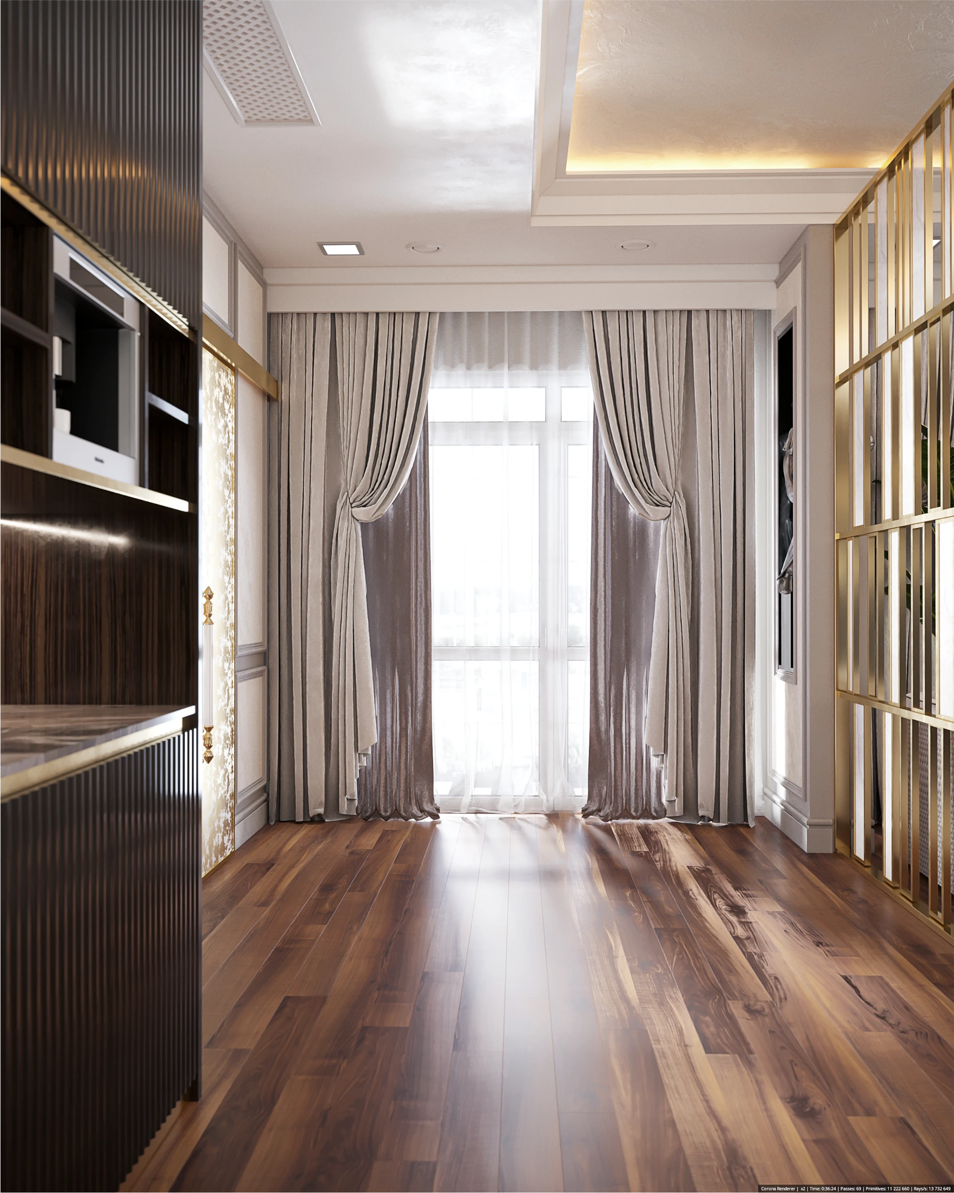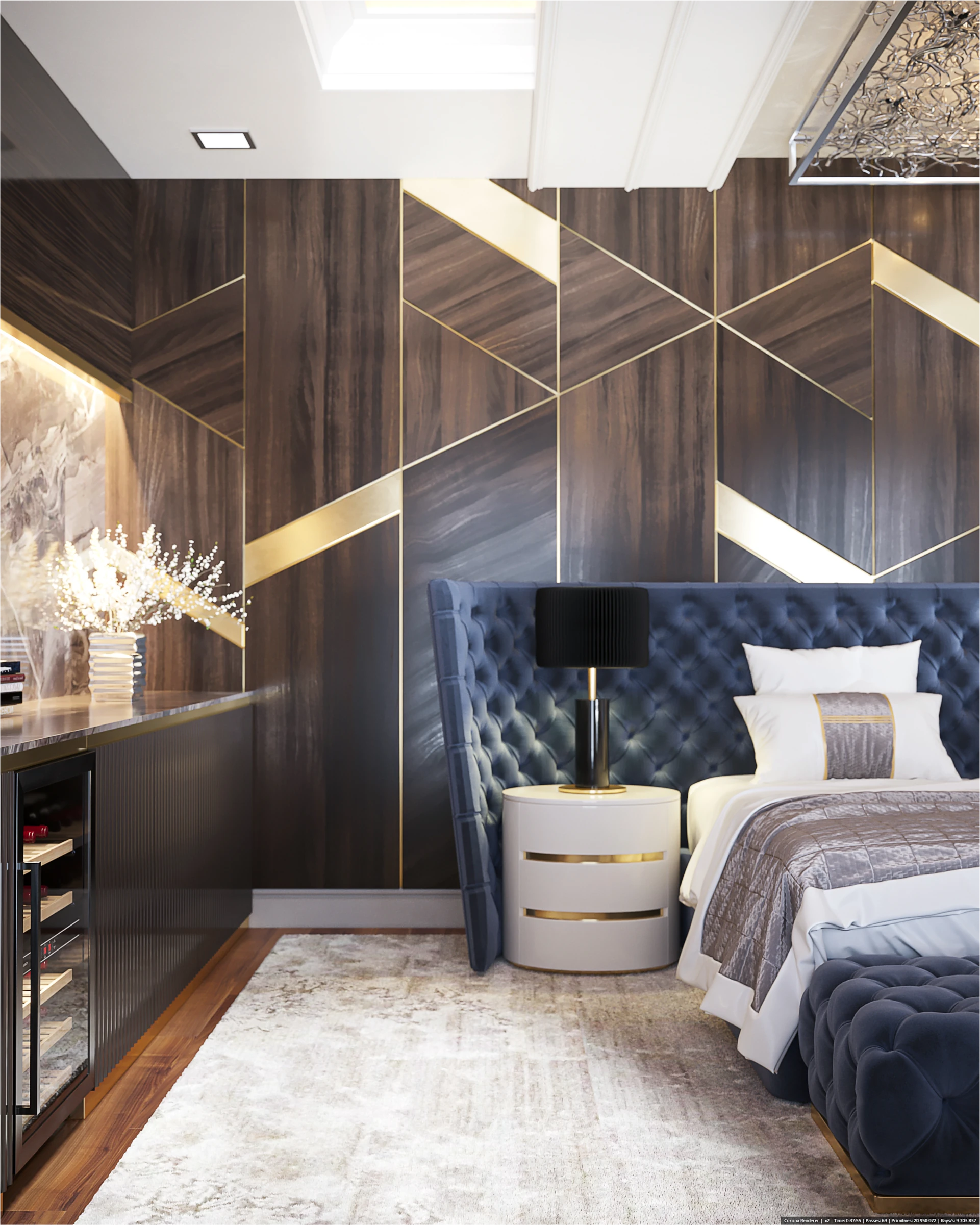 Дизайн-проект інтер’єру спальні площею 50м² в стилі неокласики. Проект поєднуює пастельні природні тони з елегантними золотими акцентами. Враховуючи сучасні потреби, дизайн інтегрує в себе розкіш та комфорт, створюючи ідеальний простір для відпочинку. Темні вкраплення вносять глибину, а різьблені елементи декору додають витонченості.