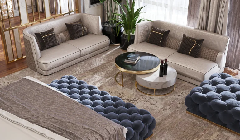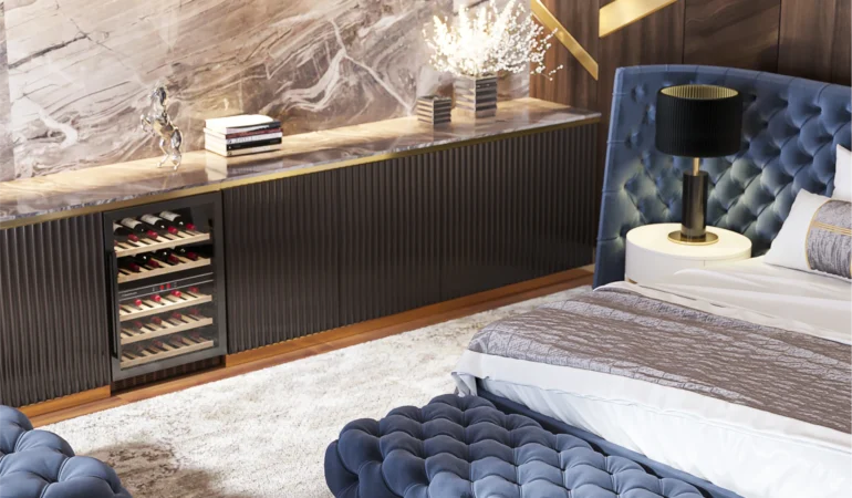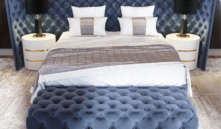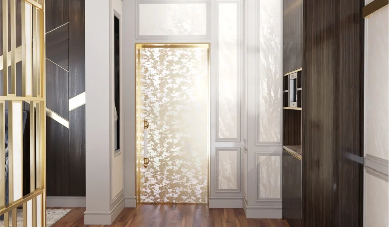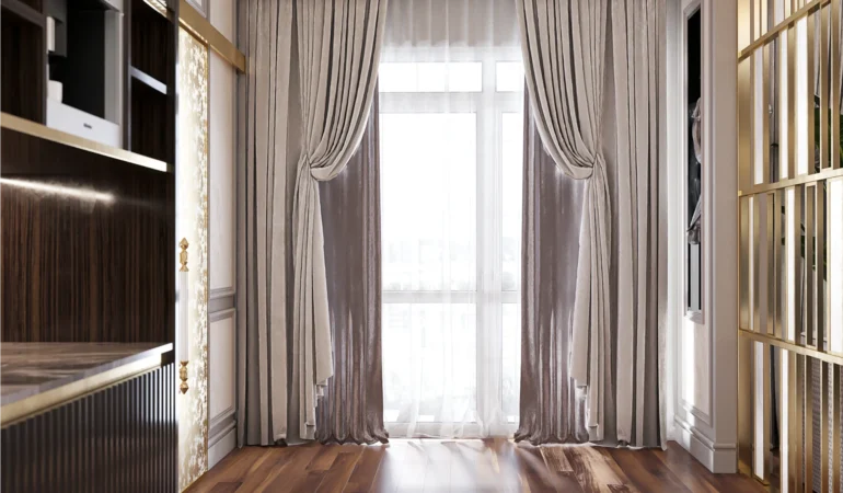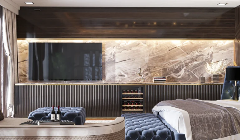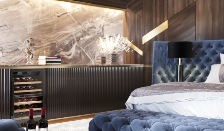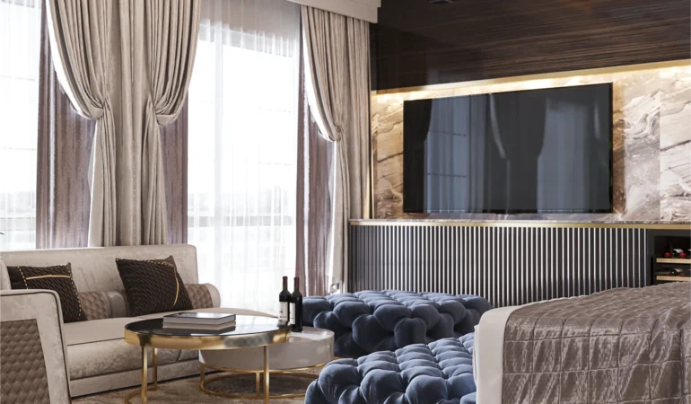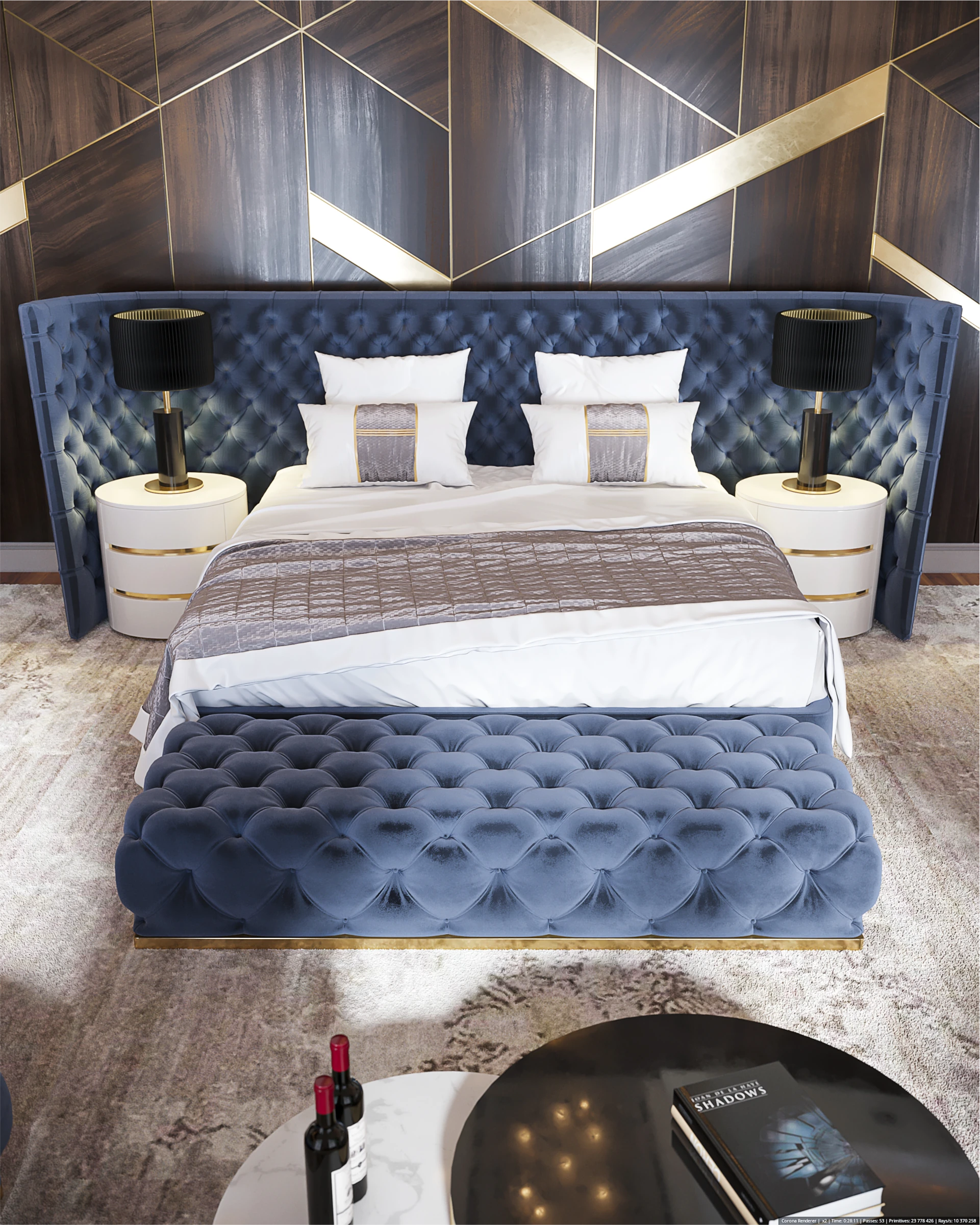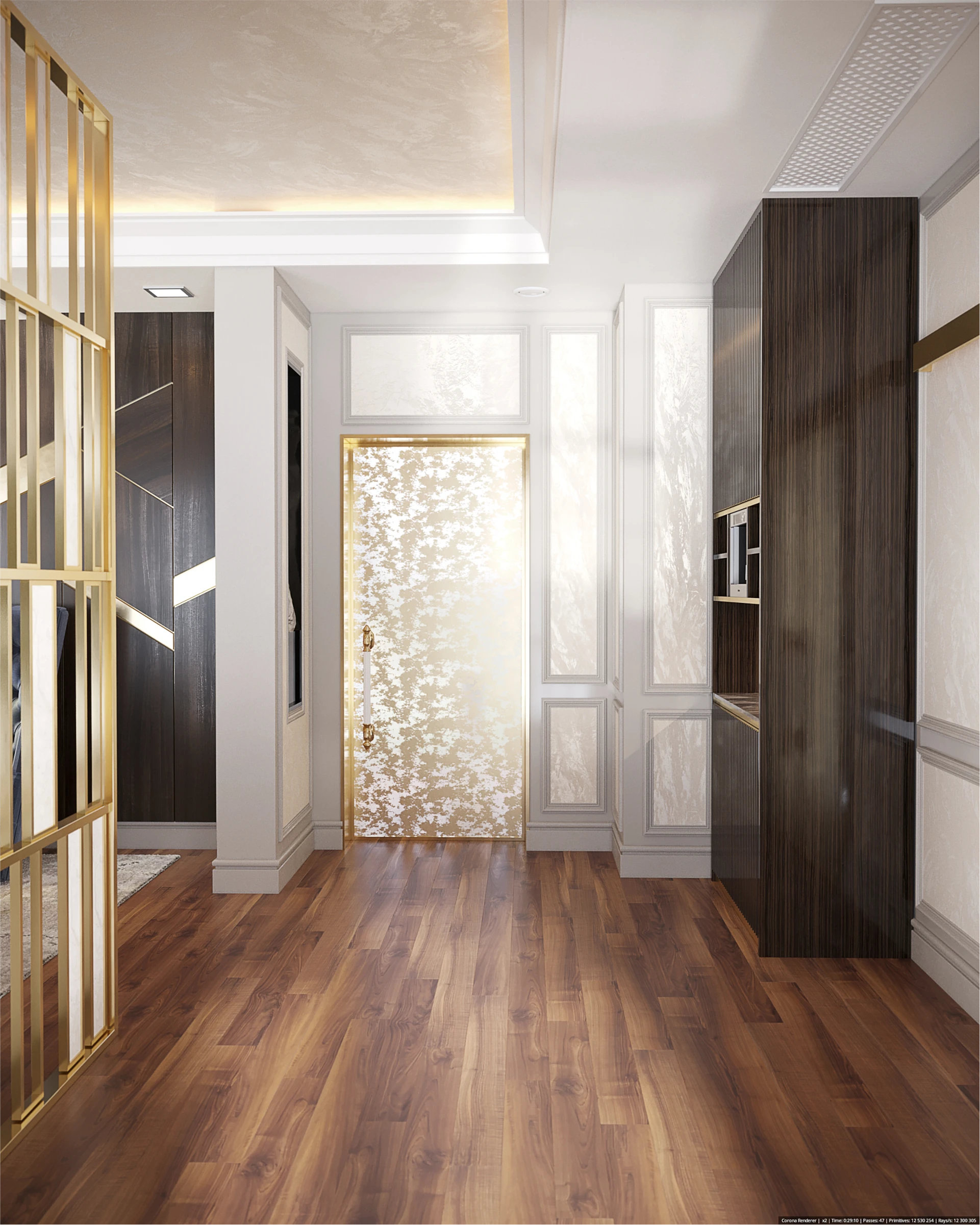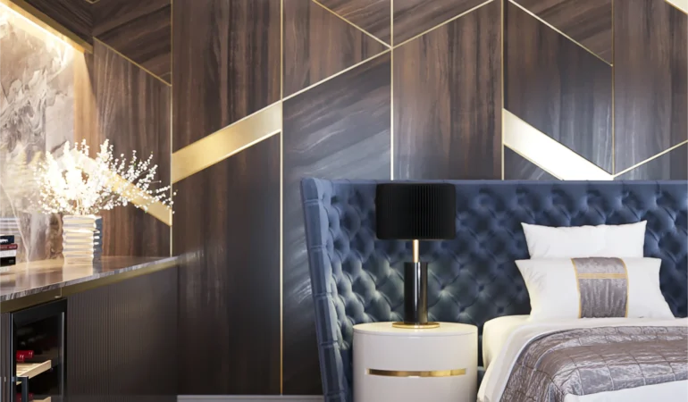 Дизайн-проект інтер’єру спальні площею 50м² в стилі неокласики. Проект поєднуює пастельні природні тони з елегантними золотими акцентами. Враховуючи сучасні потреби, дизайн інтегрує в себе розкіш та комфорт, створюючи ідеальний простір для відпочинку. Темні вкраплення вносять глибину, а різьблені елементи декору додають витонченості.