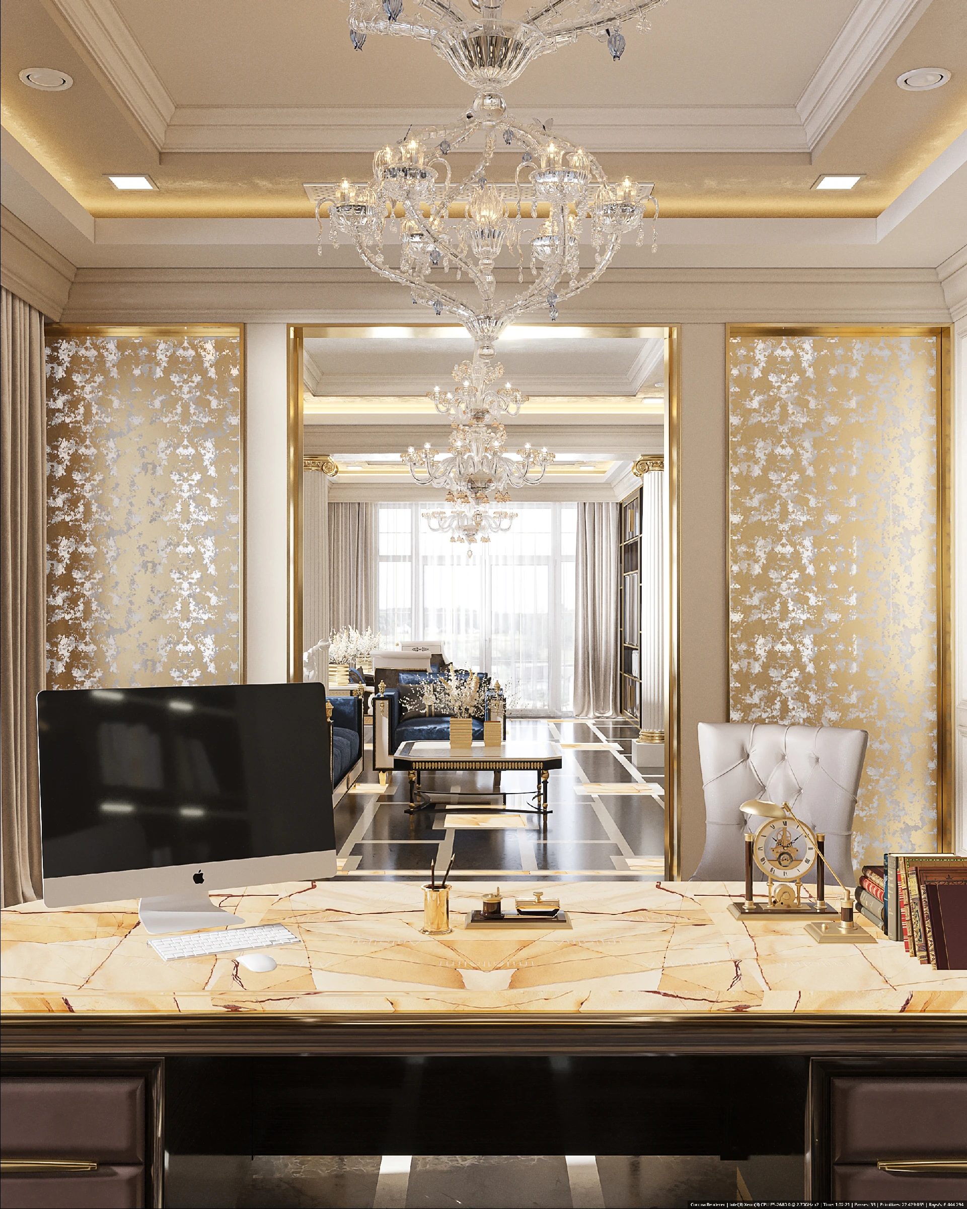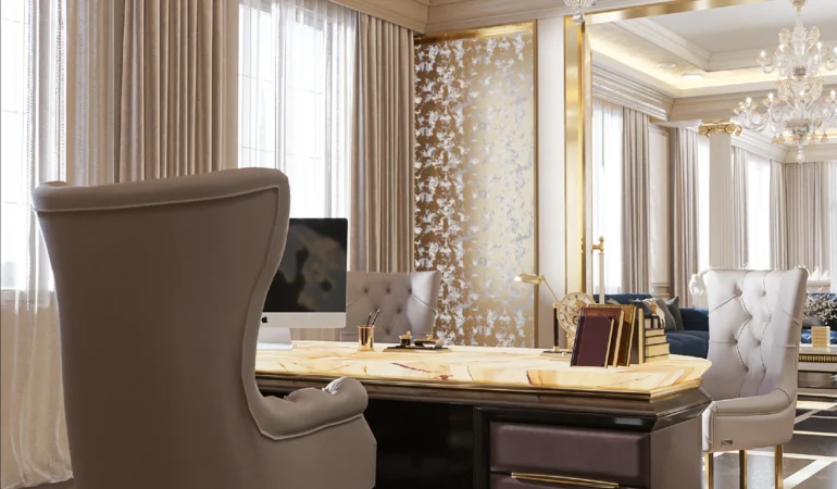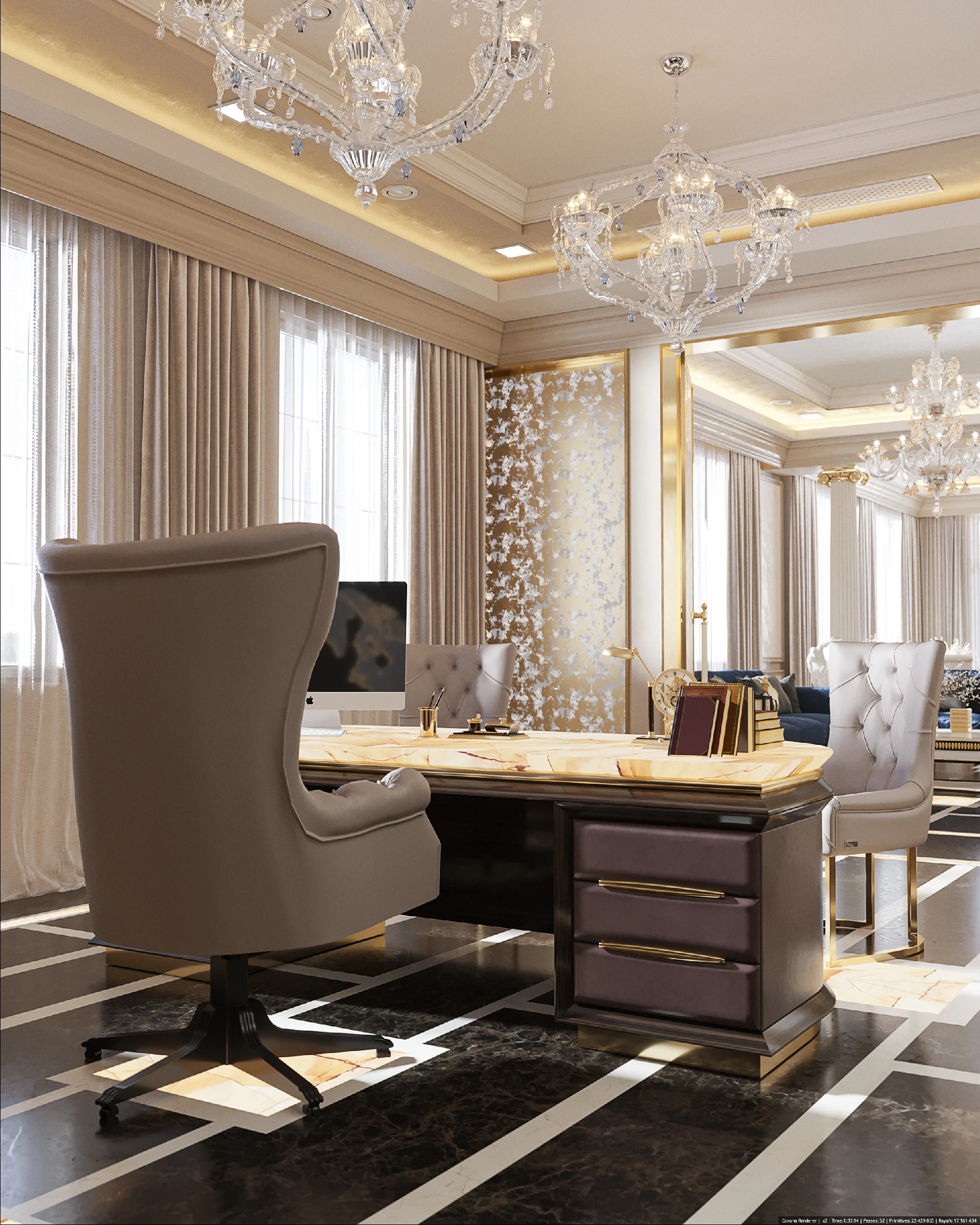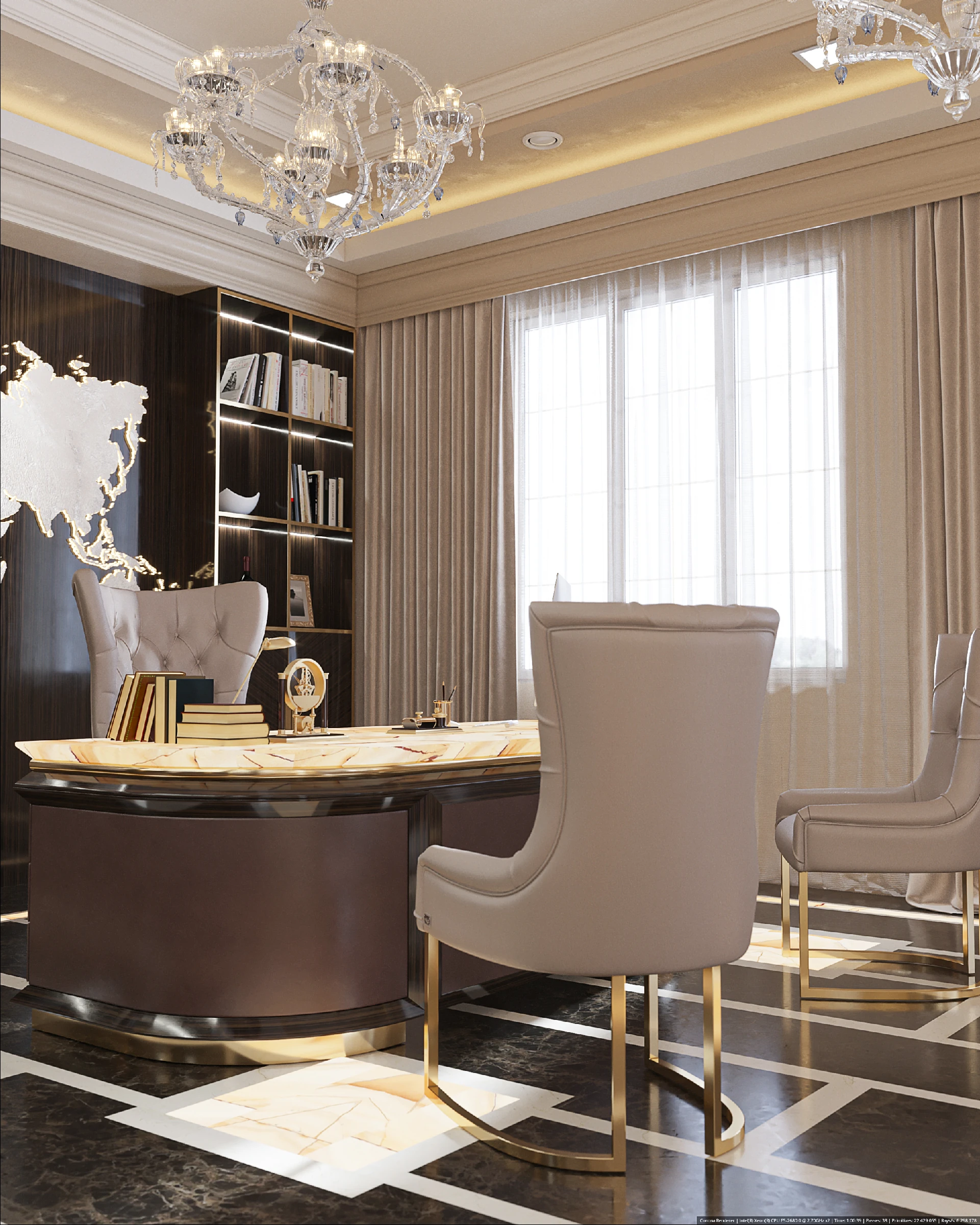 Основна робоча зона обладнана великим робочим столом, зручним кріслом та необхідною офісною технікою, що підкреслює серйозність та професіоналізм власника. При цьому використання пастельних тонів, дерев’яних елементів та класичних декоративних деталей надає атмосфері витонченості та затишку.