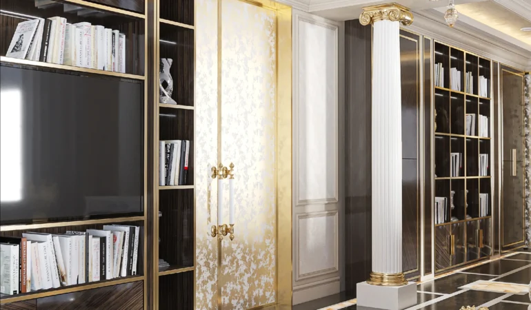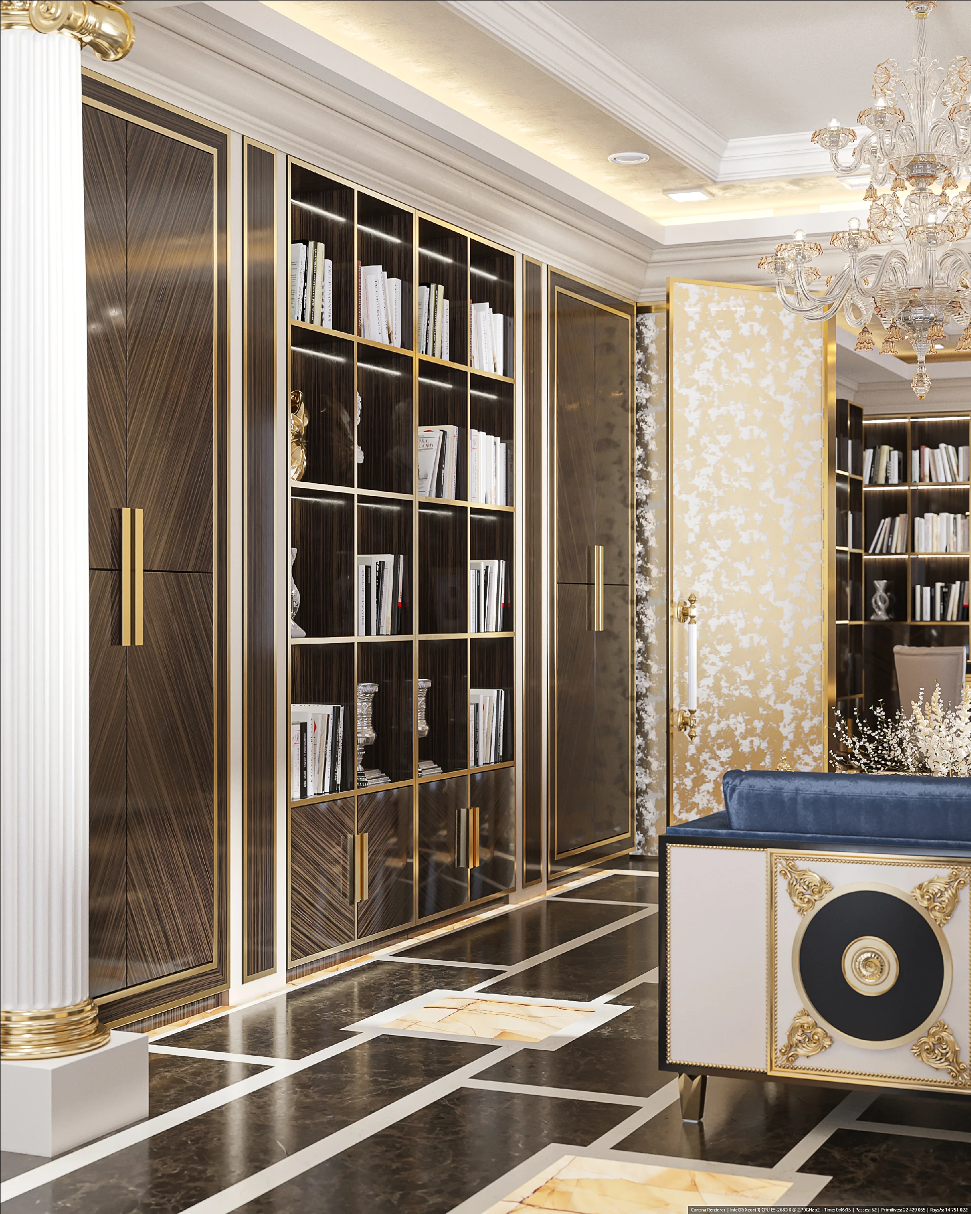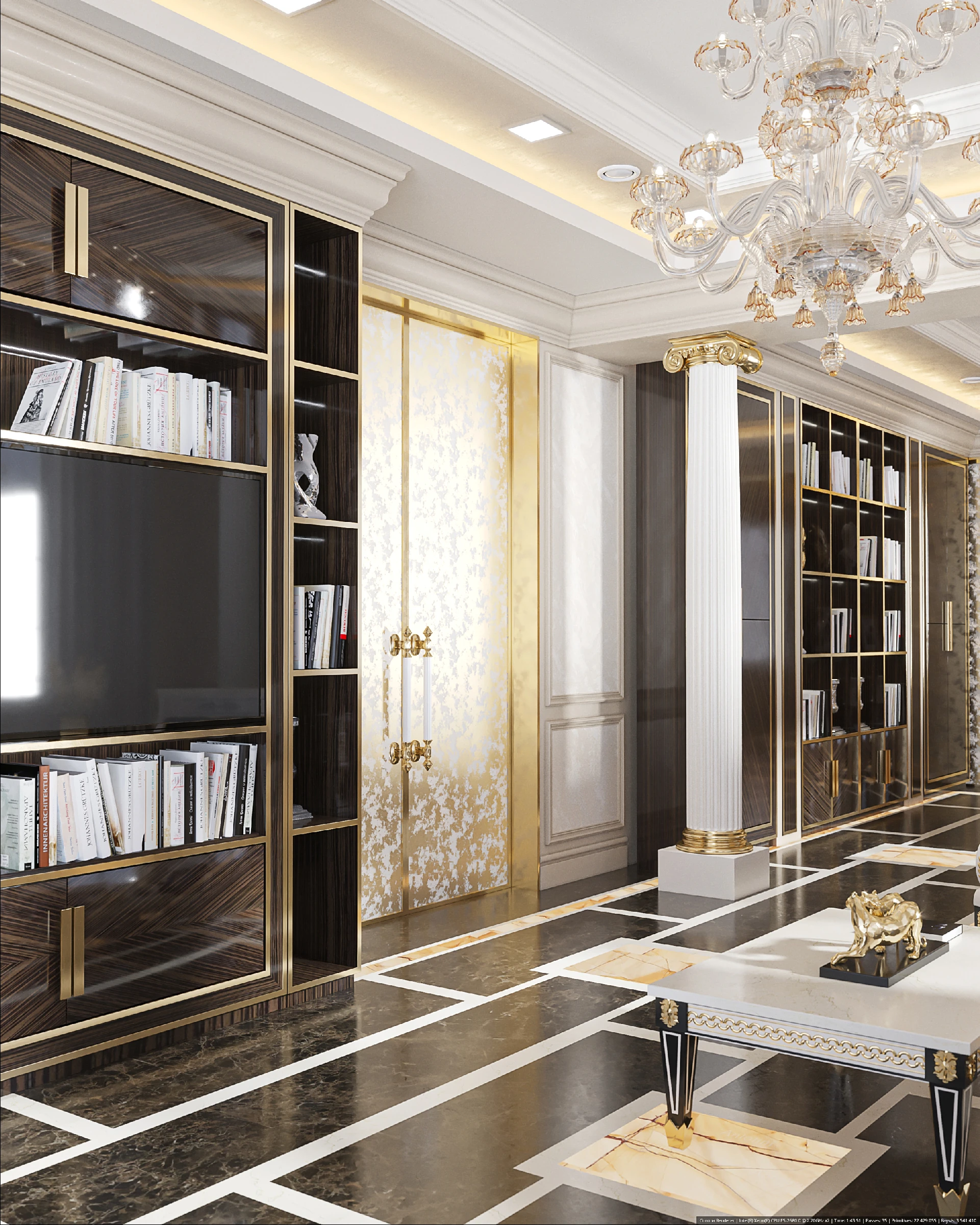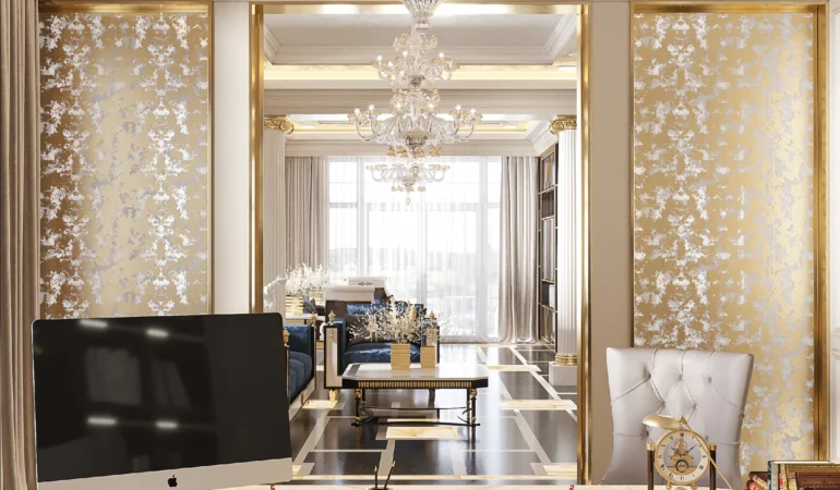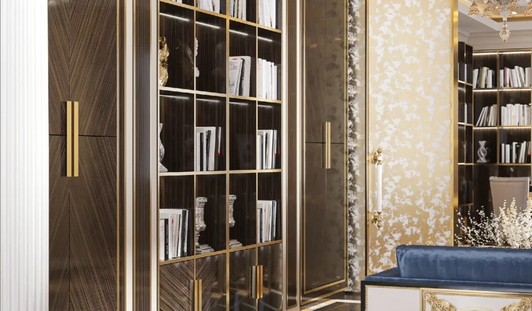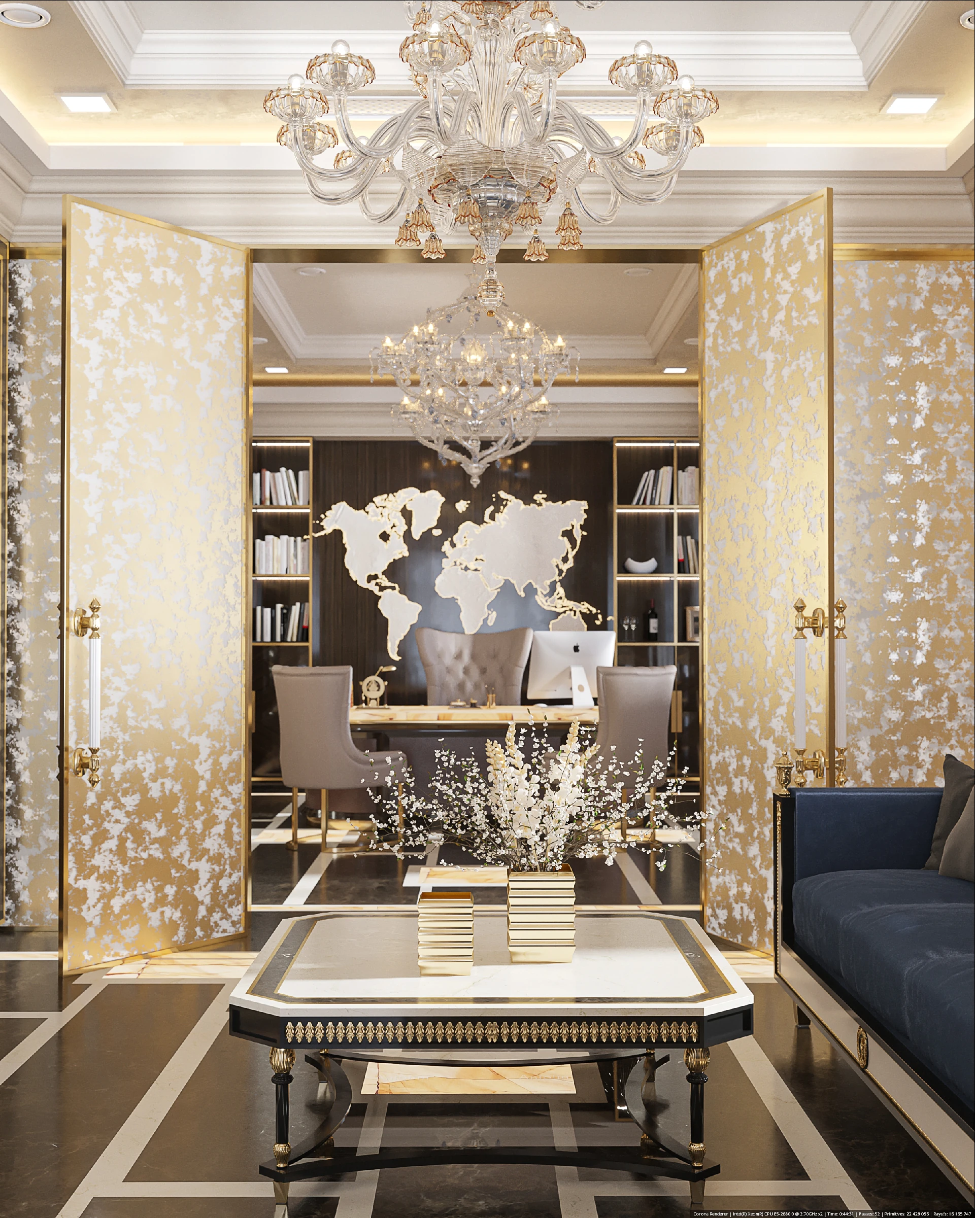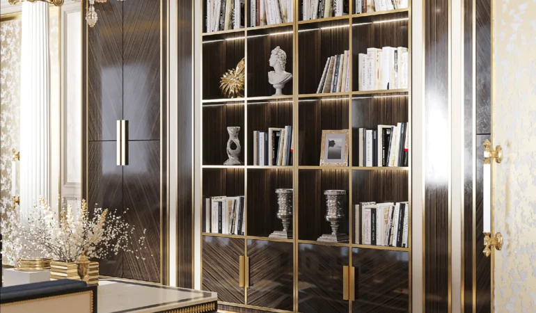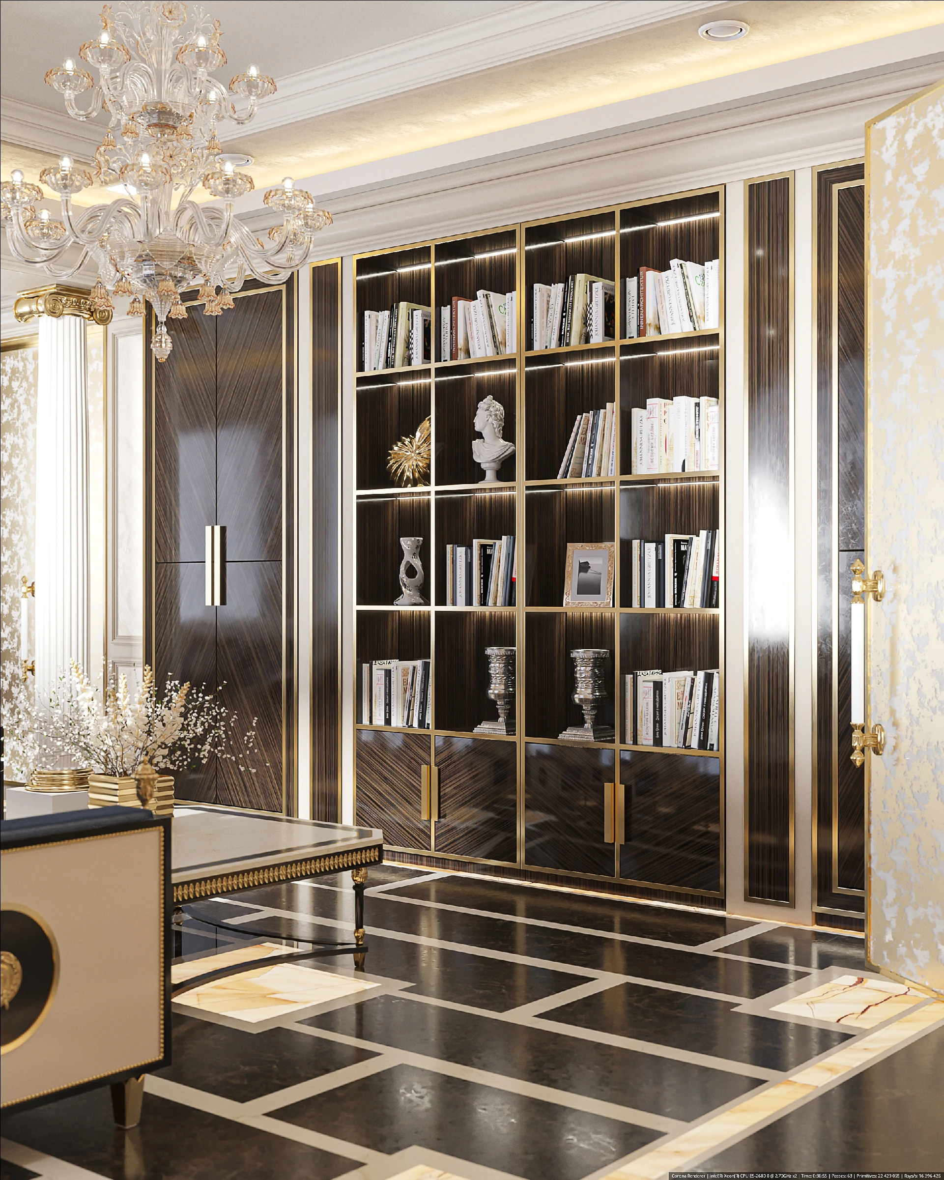 Робочий кабінет у житловому будинку загальною площею 81м² є зразком вишуканості та функціональності, оформлений у стилі неокласики. Простір розділений на дві зони вишуканою перегородкою, яка за потреби закривається, що дозволяє ефективно використовувати кабінет для різних цілей: як для зосередженої індивідуальної роботи, так і для неформальних зустрічей з гостями.