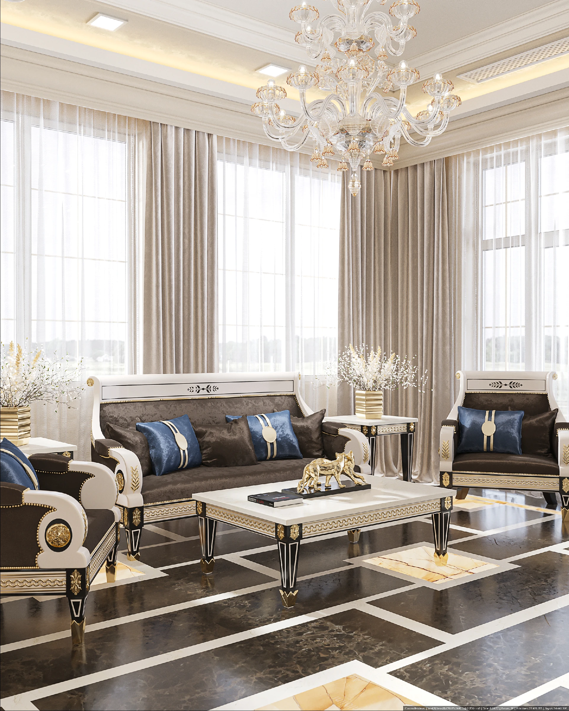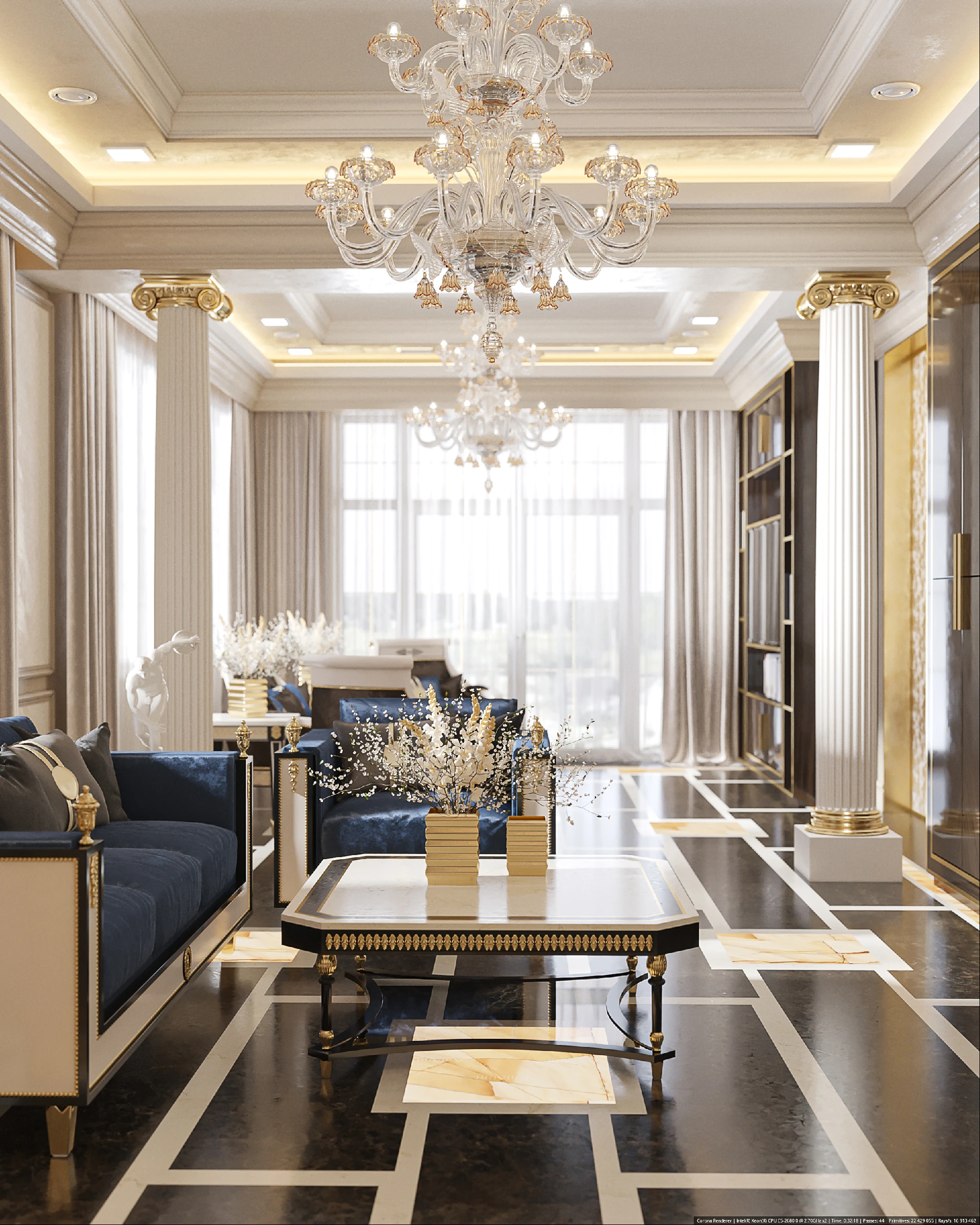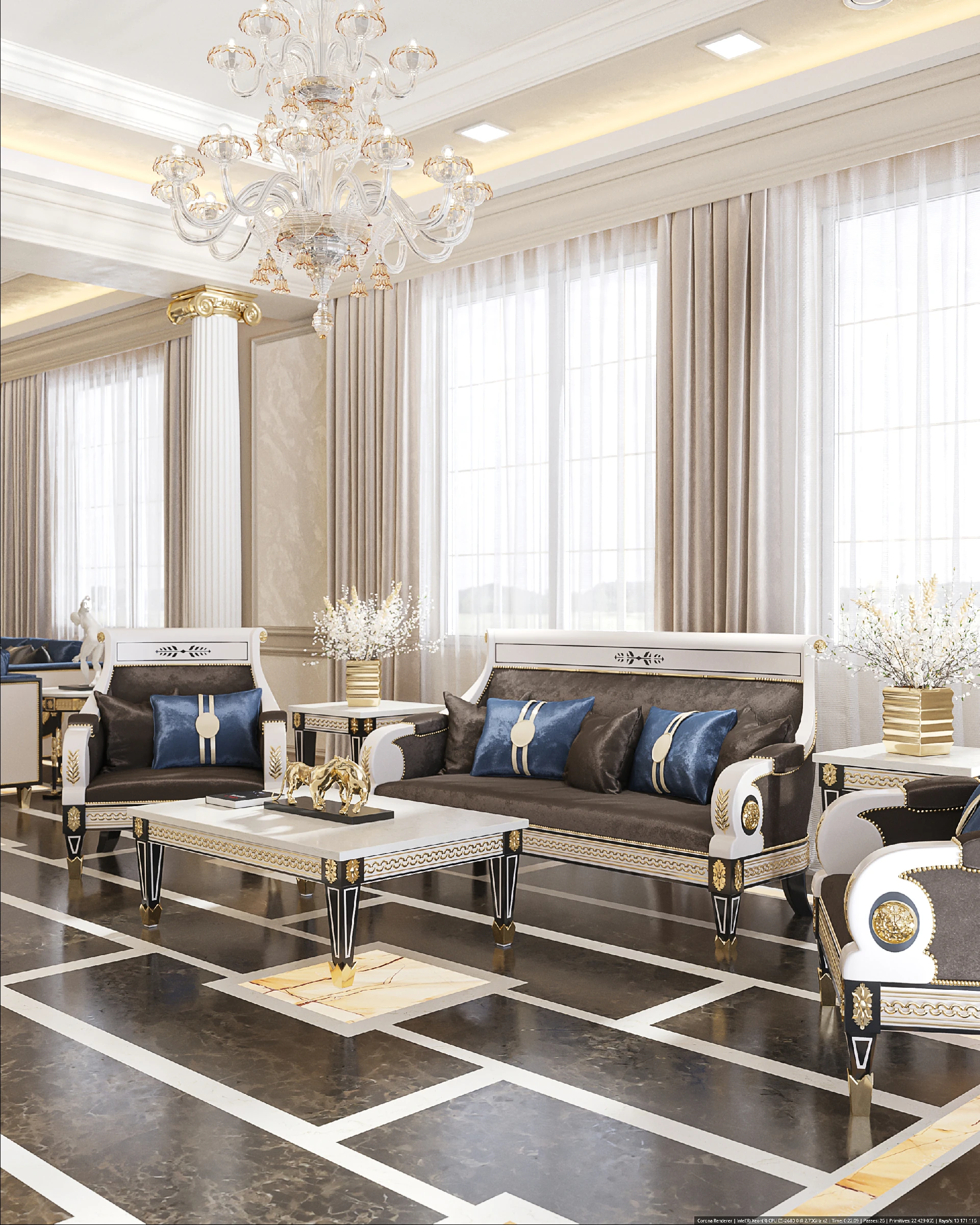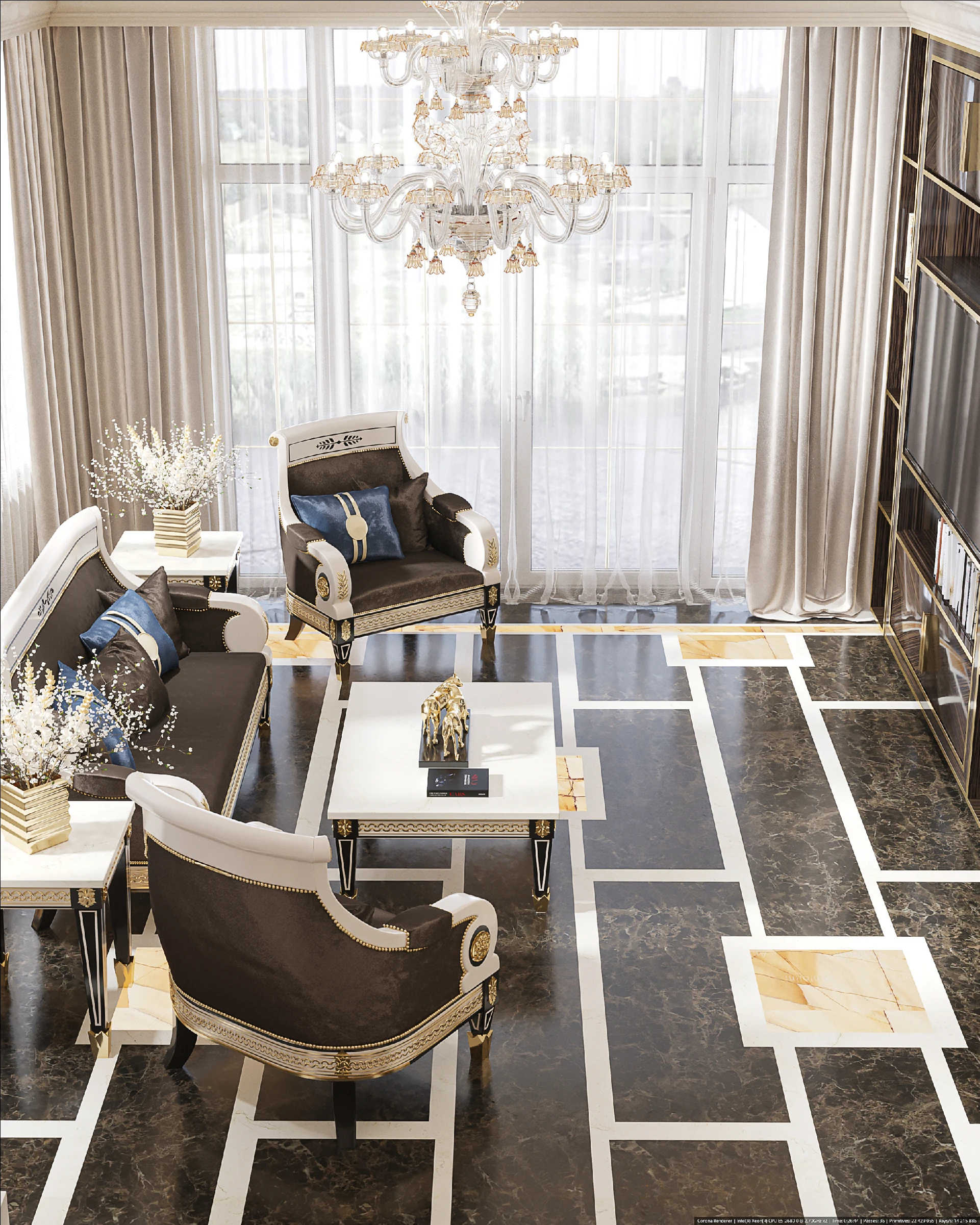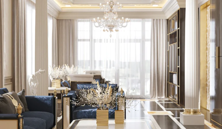Зона для неофіційних зустрічей містить м’які дивани та крісла, розташовані навколо кавового столика, створюючи ідеальний простір для розмов у розслабленій атмосфері. Світлі тони та натуральні матеріали, характерні для неокласичного стилю, доповнені елегантними світильниками, що забезпечують одночасно естетичне задоволення та комфорт.
