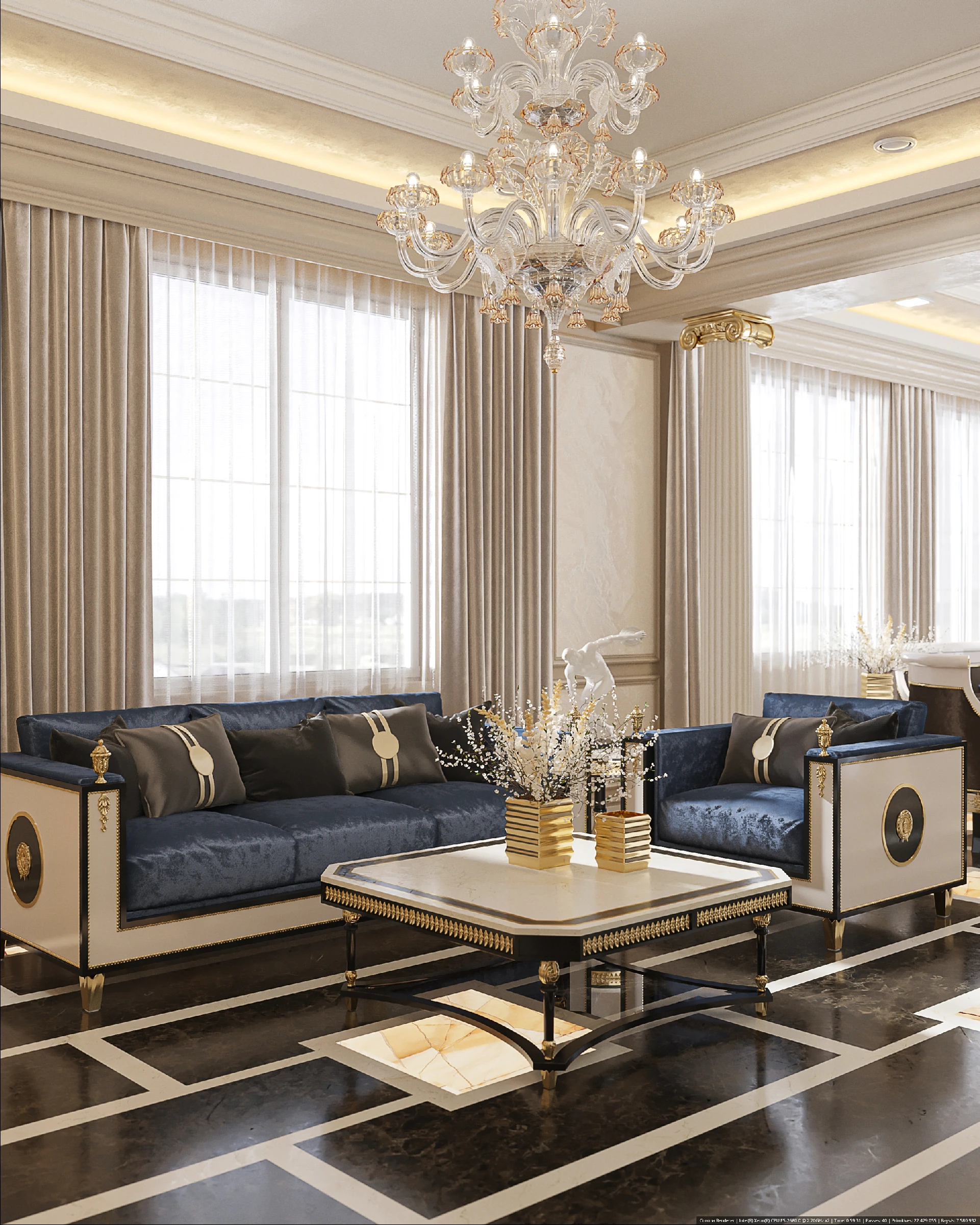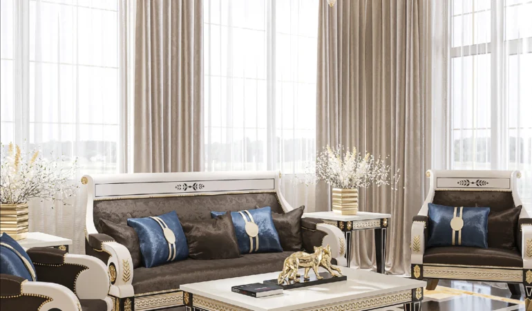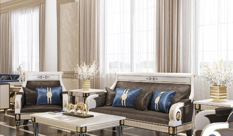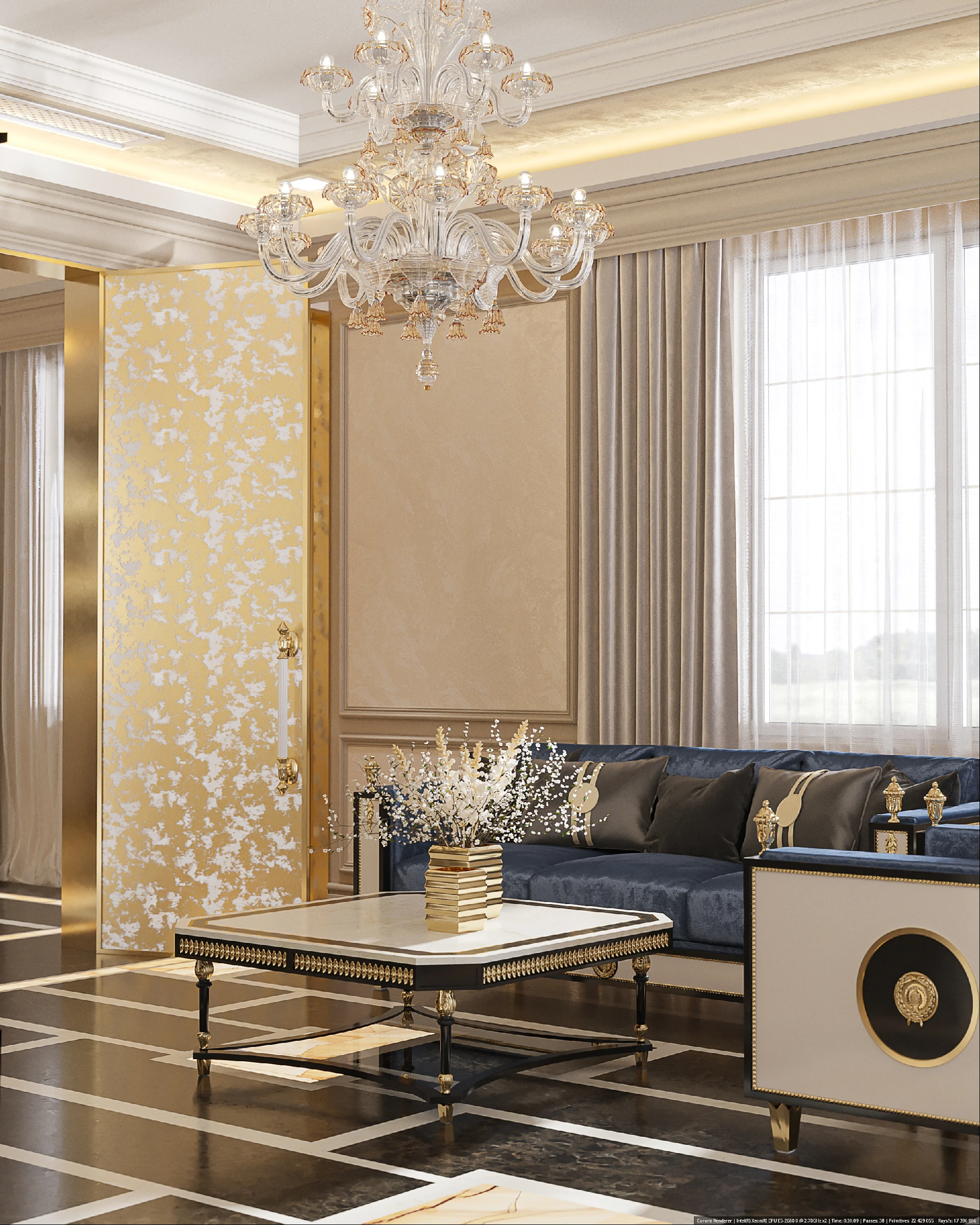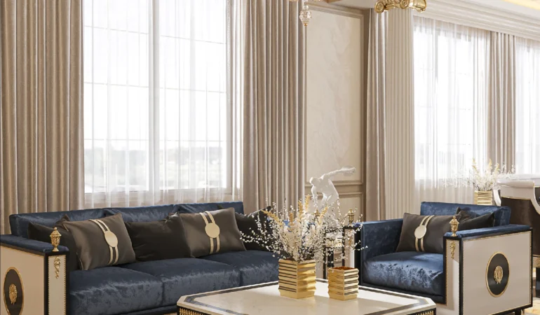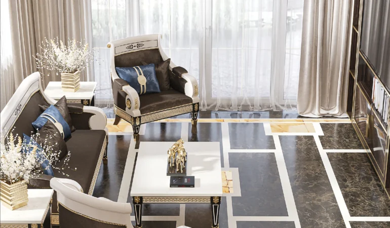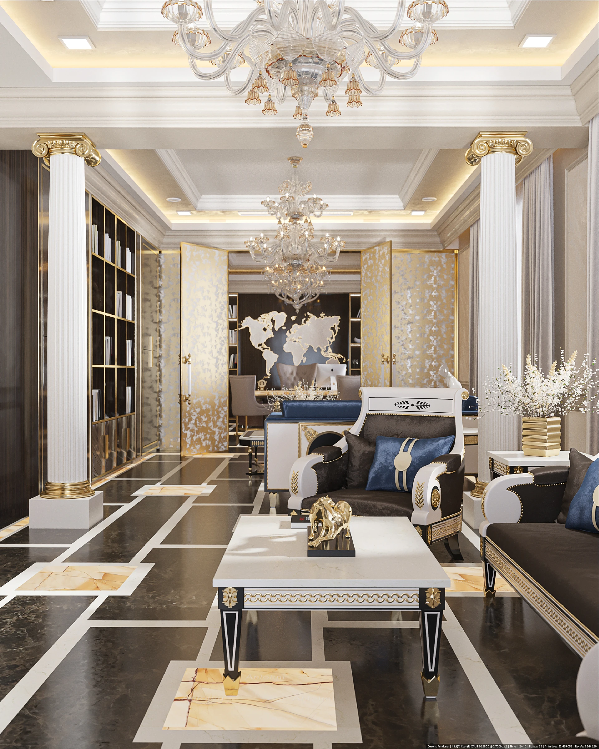 Зона для неофіційних зустрічей містить м’які дивани та крісла, розташовані навколо кавового столика, створюючи ідеальний простір для розмов у розслабленій атмосфері. Світлі тони та натуральні матеріали, характерні для неокласичного стилю, доповнені елегантними світильниками, що забезпечують одночасно естетичне задоволення та комфорт.